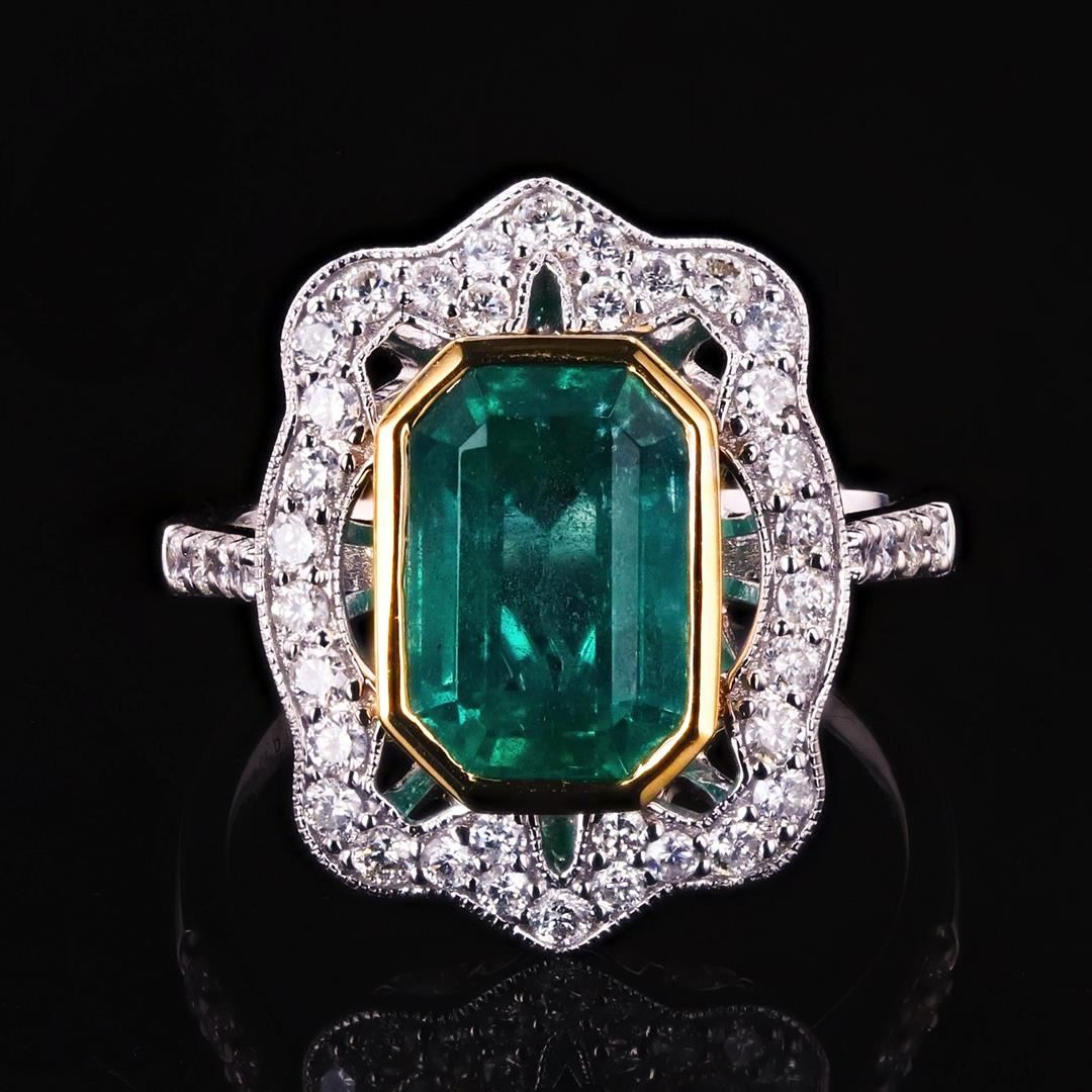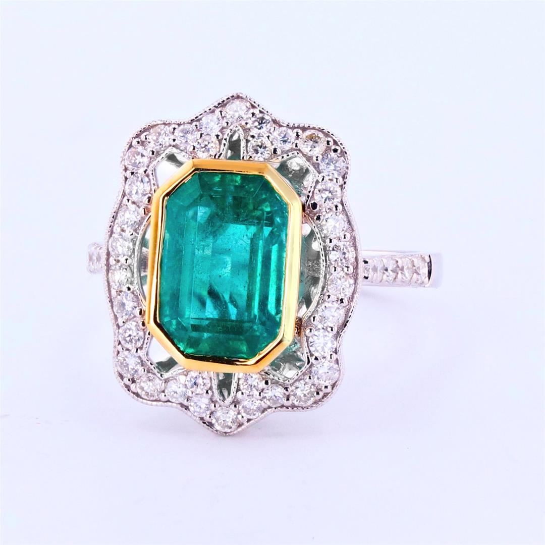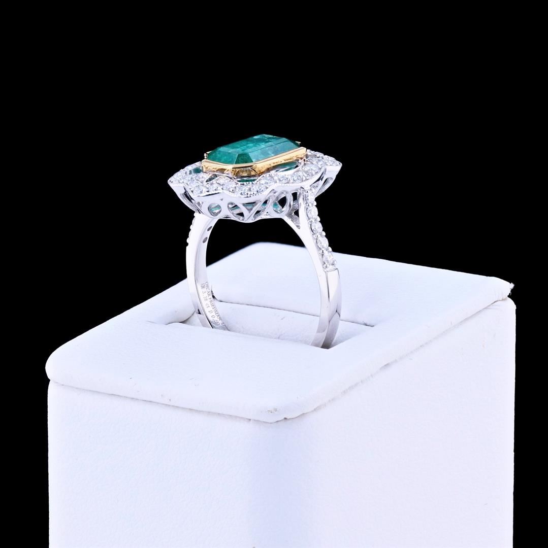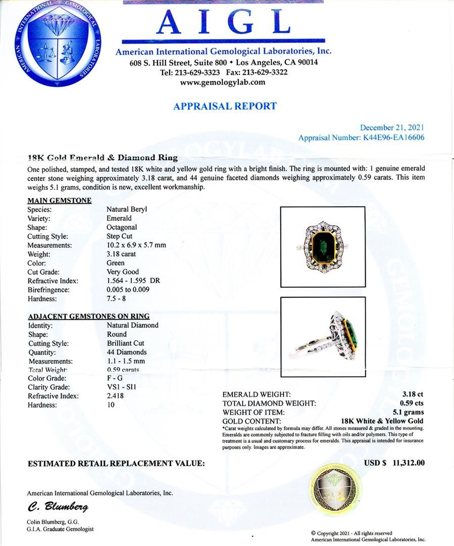 3.18ct Emerald and 0.59ctw Diamond 18K White and Yellow Gold Ring. One polished, stamped, and tested 18K white and yellow gold ring with a bright finish. The ring is mounted with: 1 genuine emerald center stone weighing approximately 3.18 carat, and 44 genuine faceted diamonds weighing approximately 0.59 carats. This item weighs 5.1 grams, condition is new, excellent workmanship. MAIN GEMSTONE Species: Natural Beryl Variety: Emerald Shape: Octagonal Cutting Style: Step Cut Measurements: 10.2 x 6.9 x 5.7mm Weight: 3.18 carat Color: Green Cut Grade: Very Good Refractive Index: 1.564 - 1.595 DR Birefringence: 0.005 to 0.009 Hardness: 7.5 - 8 ADJACENT GEMSTONES ON RING Identity: Natural Diamond Shape: Round Cutting Style: Brilliant Cut Quantity: 44 Diamonds Measurements: 1.1 - 1.5mm Total Weight. 0.59 carats Color Grade: F - G Clarity Grade: VS1 to SI1 Refractive Index: 2.418 Hardness: 10 EMERALD WEIGHT: 3.18ct TOTAL DIAMOND WEIGHT: 0.59ctw WEIGHT OF ITEM: 5.1 grams GOLD CONTENT: 18K White & Yellow Gold