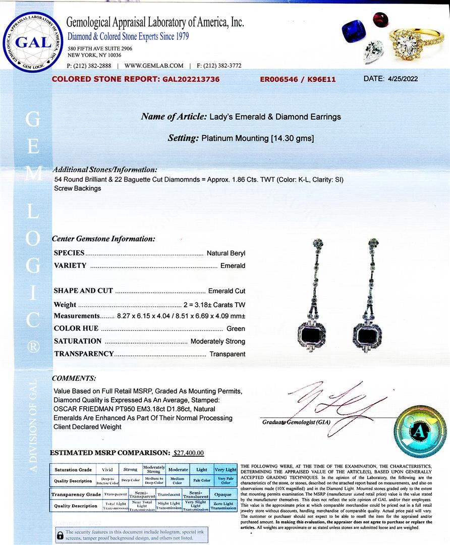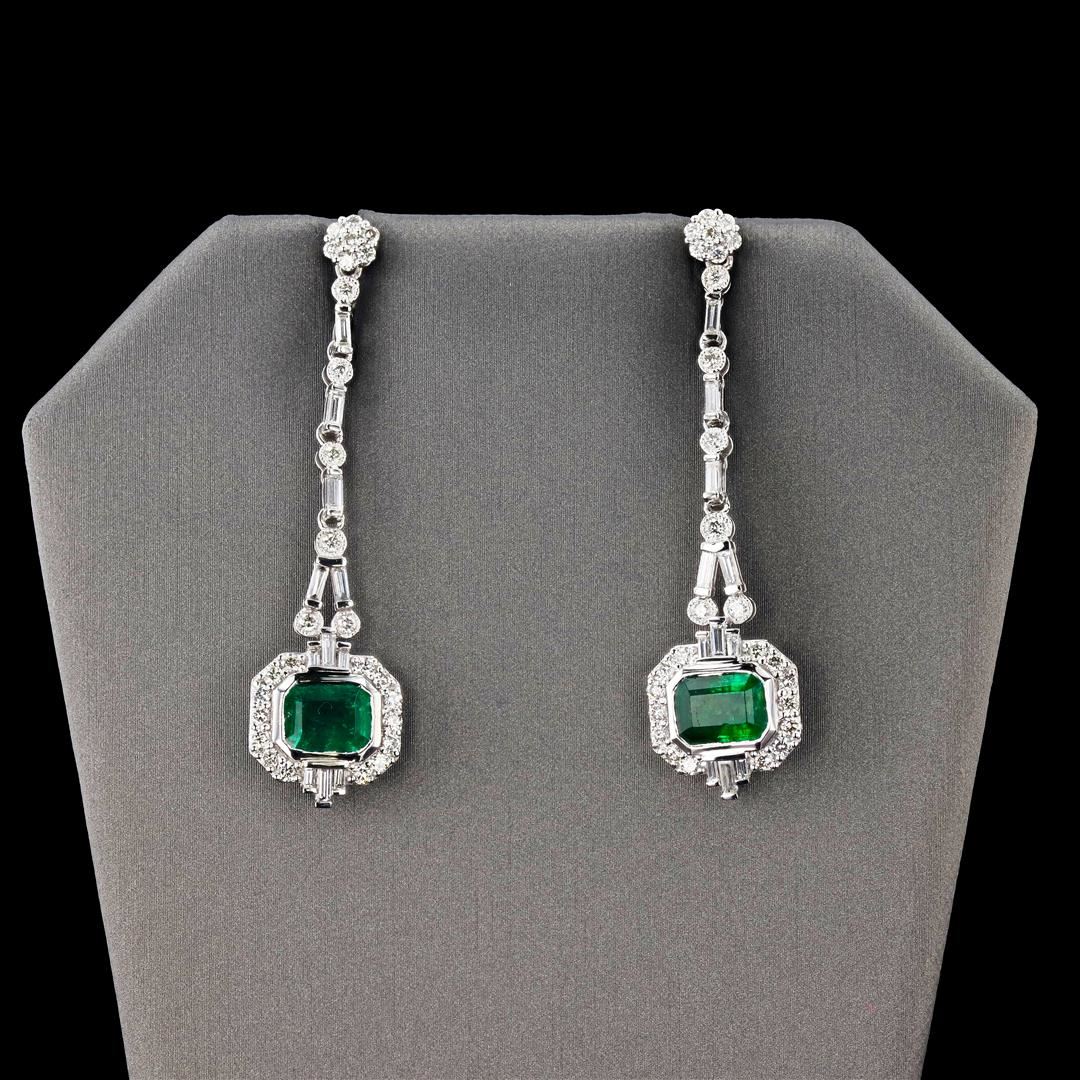Name of Article: Lady's Emerald and Diamond Earrings Setting: Platinum Mounting [14.30 gms] #Additional Stones/Information:# 54 Round Brilliant and 22 Baguette Cut Diamomnds = Approx. 1.86 Cts. TWT (Color: K-L, Clarity: SI) Screw Backings #Center Gemstone