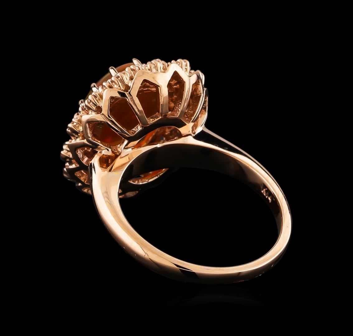 One electronically tested 14KT rose gold lady's cast fashion ring with a double basket halo with a bright polish finish. The featured lady's ring has a shank measuring 1.98 millimeters wide. Identified with markings of "K14". Condition is new, good workmanship. Containing: One jelly opal that is cut in a oval shaped cabochon and is prong set, measuring 12.30 mm long x 10.65 mm wide, and 4.95 mm thick and the approximate weight is 3.18 carats. The opal has a somewhat bright, orange-red play of color (fire) in a rolling flashfire pattern; a medium dome; a good cut; no inclusions; consistent in its brightness and pattern; and is not directional. Graded in the setting. Twenty-Eight prong set round brilliant cut diamonds, measuring 1.80 - 1.70 x 1.09mm (depth est.) approximate total weight of 28 Stones = 0.58ct. Graded in the setting. Clarity: SI-1 to SI-2. Color: H - I. Cut Good. Total Weight of Diamonds 0.58ct. Total Weight of Opals 3.18ct. Total Weight of Ring 7.50gm. GAS Appraised at $2,815.00.