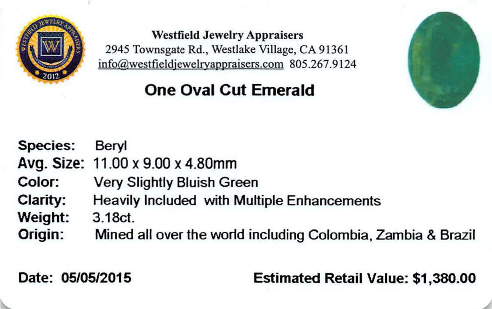 One oval mixed cut natural emerald, measuring 11.00 x 9.00 x 4.80mm, exact weight 3.18ct., clarity is heavily included, type III, dark, very slightly grayish, very slightly bluish green color, (GIA vslbG 7/3), cut is good. Indications of multiple laboratory enhancements, including high temperature heat treatment. Westfield Appraised at $1,380.00.