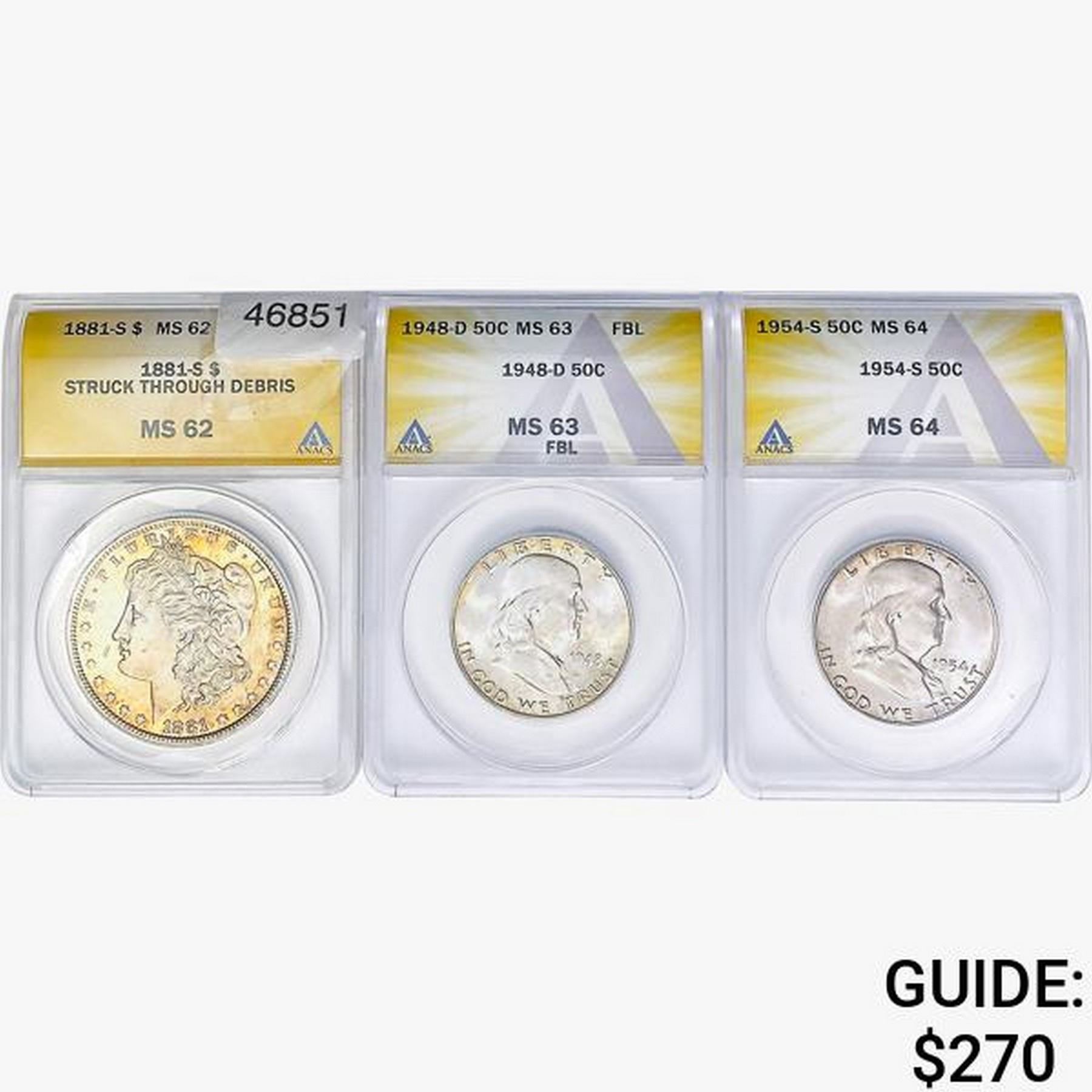 [3] 1881-1954 $1 Morgan Coin, [2] 50C Franklin Coin ANACS