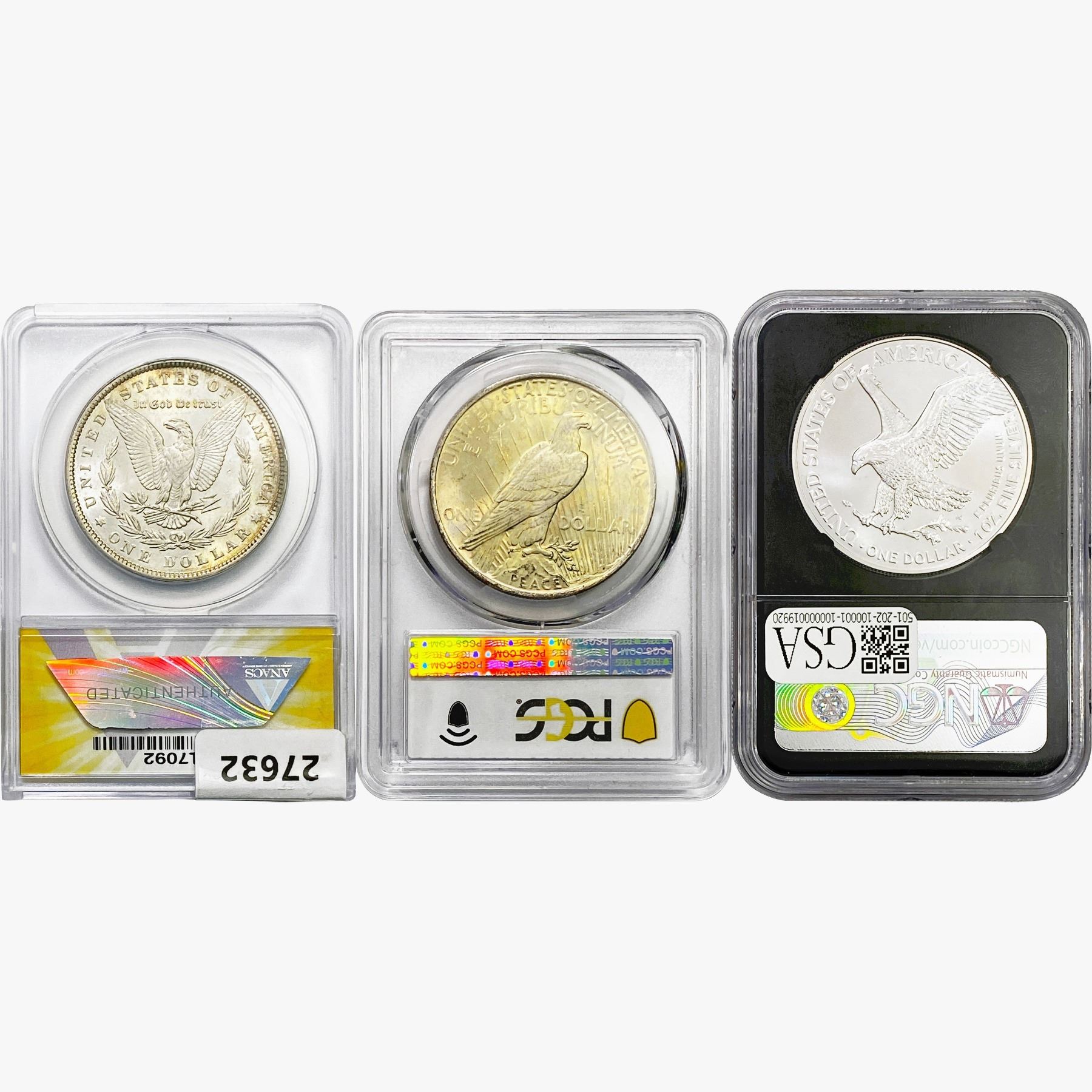 e. Coins sold referencing a third-party grading service are sold “AS IS” without any express or implied warranty, except for a guarantee by GSA that they are genuine. Removal or alteration of the holder, voids all of Bidder’s claims concerning that Product. Certain warranties may be available from the grading services and Bidders are referred to them for further details: Numismatic Guaranty Corporation (NGC), PO Box 4776, Sarasota, FL 34230, www.ngccoin.com/services/writtenguarantee.asp; Professional Coin Grading Services (PCGS), PO Box 9458, Newport Beach, CA 92658, www.pcgs.com/guarantee.html; ANACS, 6555 S. Kenton St., Ste. 303, Englewood, CO 80111; and Independent Coin Grading Co. (ICG), 7901 East Bellview, Ave., Suite 50, Englewood, CO 80111.