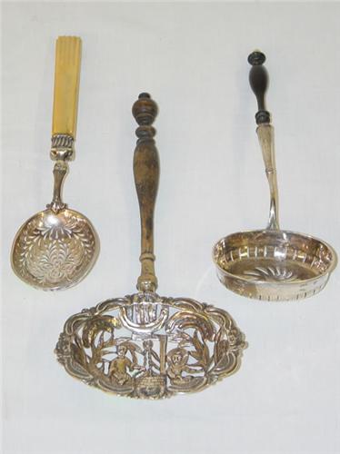 (3) 18TH CENT. CONTINENTAL SILVER PIERCE DECORATED SERVING UTENSILS W/ TURNED WOOD & IVORY HANDLES: (1) SKIMMER, (1) LADLE, & (1) SPOON - HALLMARKED, TARNISH & IMPERFECTIONS