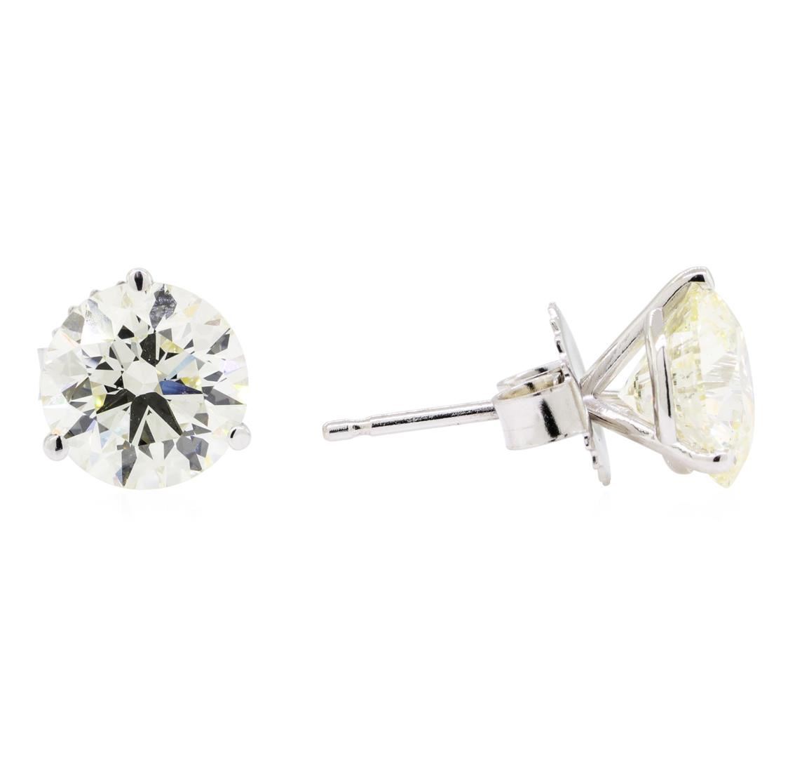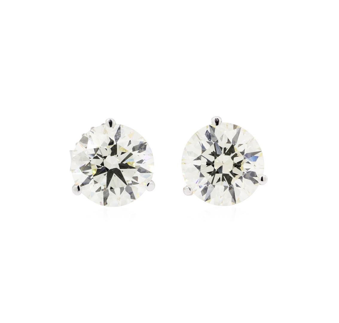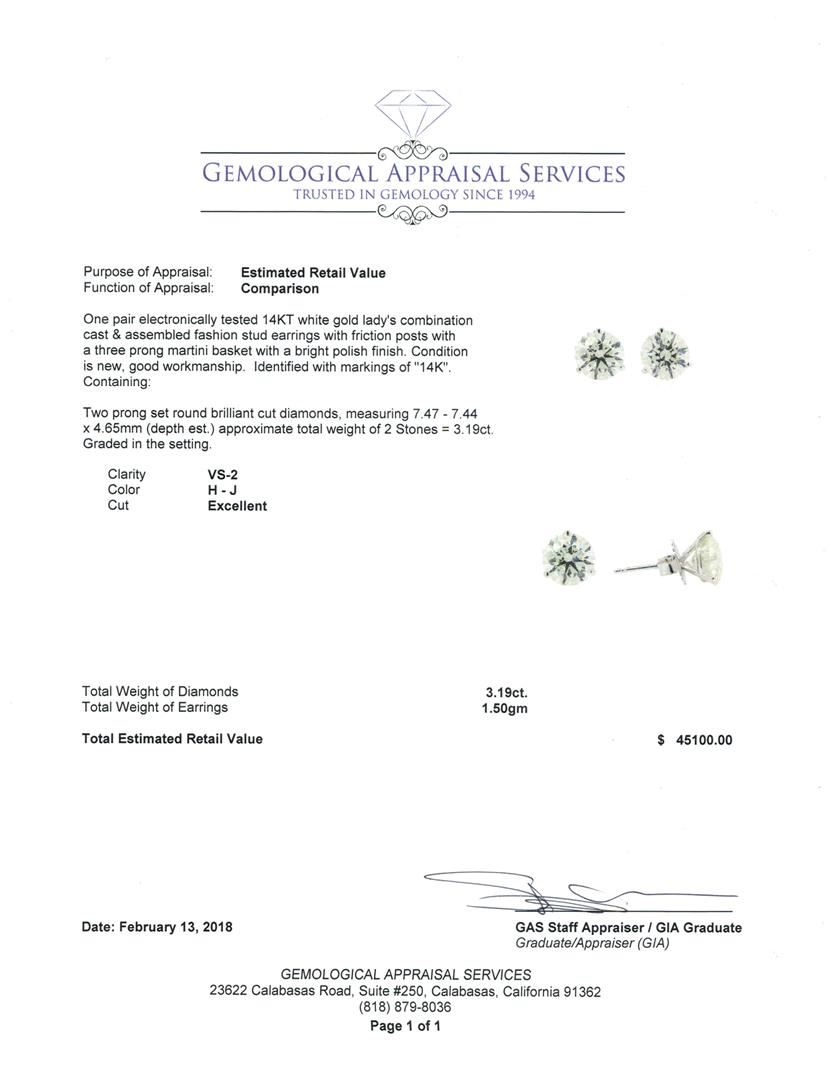 One pair electronically tested 14KT white gold lady's combination cast & assembled fashion stud earrings with friction posts with a three prong martini basket with a bright polish finish. Identified with markings of '14K'. Condition is new, good workmanship. Containing: Two prong set round brilliant cut diamonds, measuring 7.47 - 7.44 x 4.65mm (depth est.) approximate total weight of 2 Stones = 3.19ct. Graded in the setting. Color H - J Clarity VS-2 Cut Excellent. Total Weight of Diamonds 3.19ct.. Total Weight of Earrings 1.50gm GAS Appraised at $45100.00. GAS Appraised at $45,100.00.
