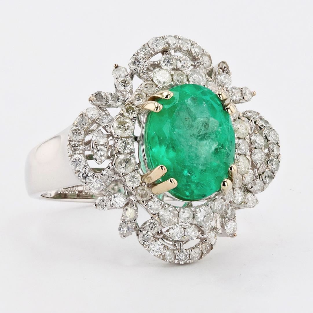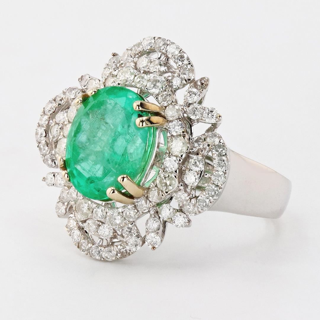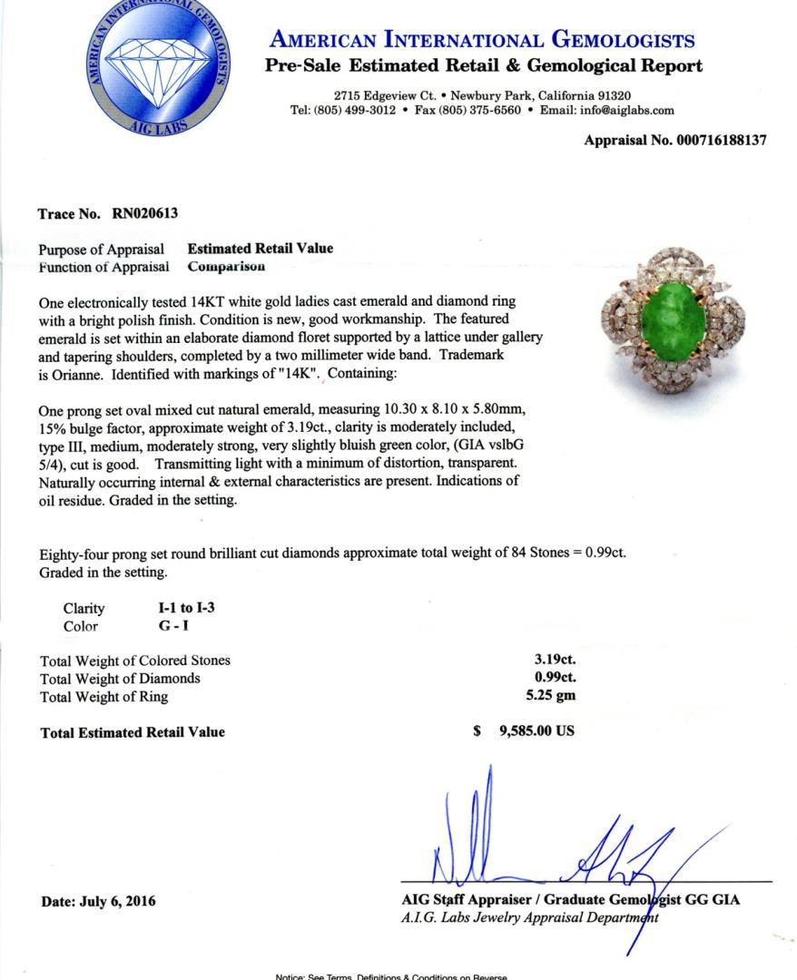 One electronically tested 14KT white gold ladies cast emerald and diamond ring with a bright polish finish. Condition is new, good workmanship. The featured emerald is set within an elaborate diamond floret supported by a lattice under gallery and tapering shoulders, completed by a two millimeter wide band. Trademark is Orianne. Identified with markings of "14K". Containing: One prong set oval mixed cut natural emerald, measuring 10.30 x 8.10 x 5.80mm, 15% bulge factor, approximate weight of 3.19ct., clarity is moderately included, type III, medium, moderately strong, very slightly bluish green color, (GIA vslbG 5/4), cut is good. Transmitting light with a minimum of distortion, transparent. Naturally occurring internal & external characteristics are present. Indications of oil residue. Graded in the setting. Eighty-four prong set round brilliant cut diamonds approximate total weight of 84 Stones = 0.99ctw. Graded in the setting. Clarity I1 to I3 Color G - I Total Weight of Colored Stones 3.19ct. Total Weight of Diamonds 0.99ctw. Total Weight of Ring 5.25 gm
