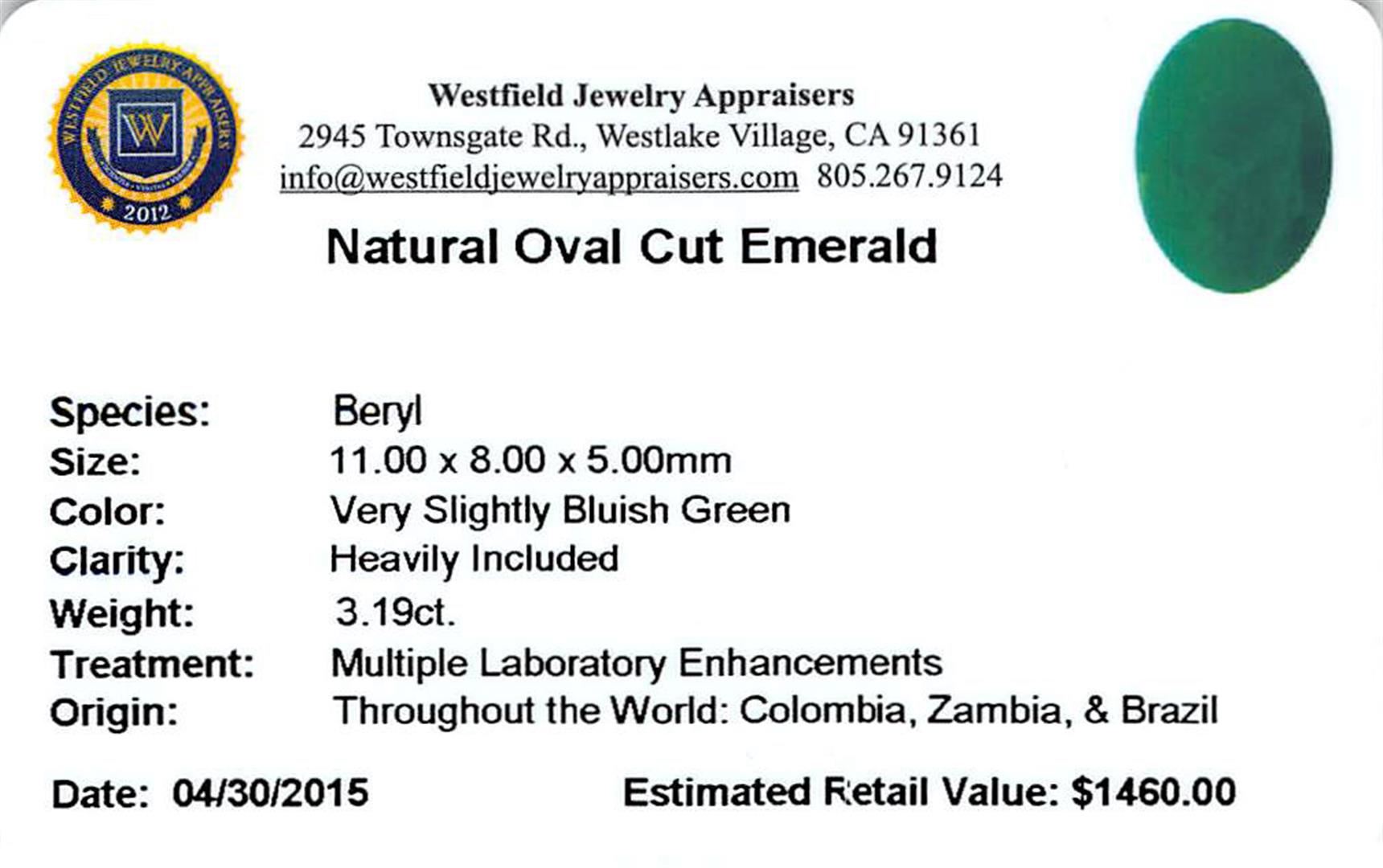 One oval mixed cut natural emerald exact weight 3.19ct., clarity is heavily included, type III, medium dark, very slightly grayish, very slightly bluish green color, (GIA vslbG 6/3), cut is good. Westfield Appraised at $1,460.00.