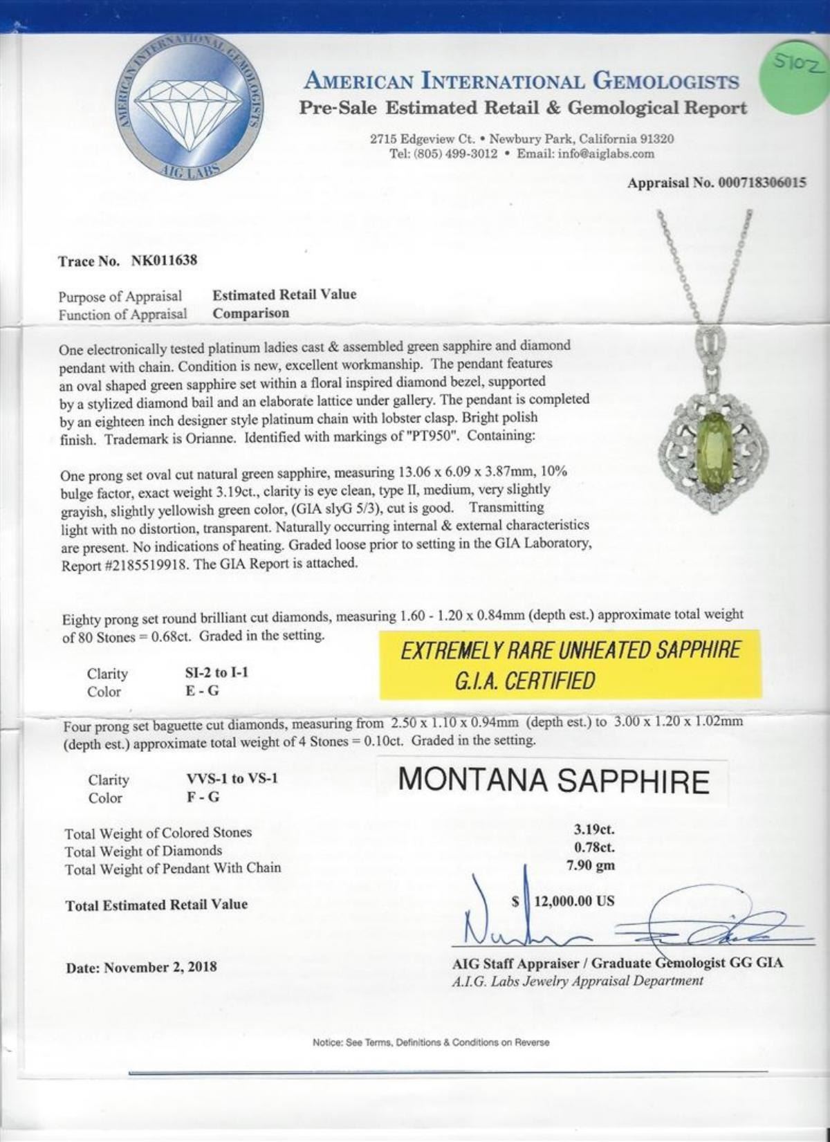 One 3.19ct Sapphire and Diamond Pendant With Chain - Platinum. AIG certified. See Appraisal for more details. AIG Appraised.