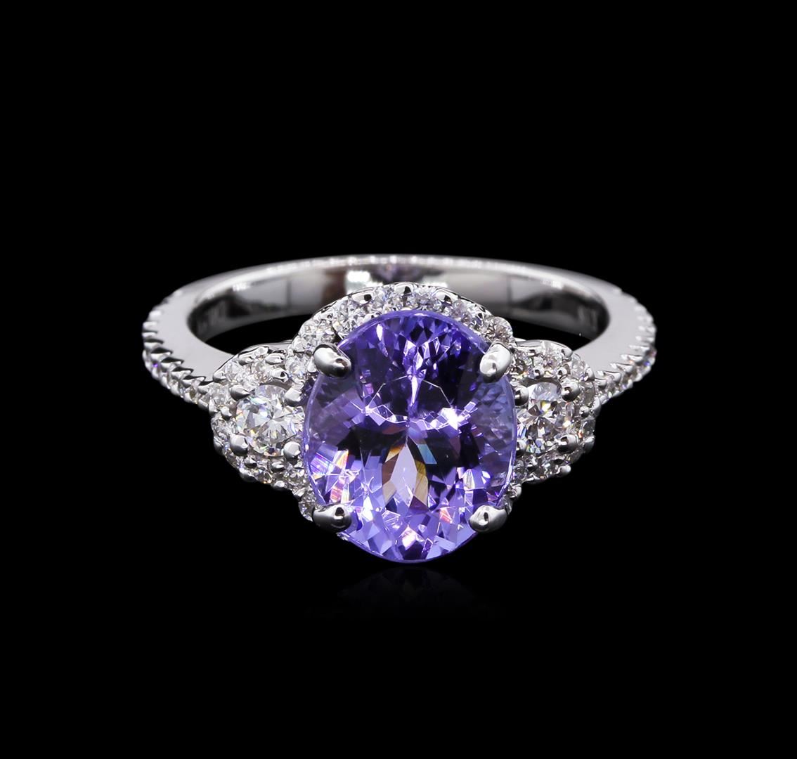 One electronically tested 18KT white gold lady's cast fashion ring with a bright polish finish. The featured lady's ring has a shank measuring 2.33 millimeters in width. Identified with markings of "K18". Condition is new, good workmanship. Containing: One prong set oval modified brilliant cut natural tanzanite, measuring 10.15 x 8.22 x 6.02mm, approximate weight of 3.19ct., clarity is eye clean, type I, medium light, very slightly grayish, bluish violet color, (GIA bV 4/3), cut is very good. Colored gemstones are presumed to have been subjected to commonly used enhancement processes. Graded in the setting. Two prong set round brilliant cut diamonds, measuring 2.90 - 2.80 x 1.80mm (depth est.) approximate total weight of 2 Stones = 0.18ct. Graded in the setting. Clarity: SI-1. Color: Good Fifty prong set round brilliant cut diamonds, measuring 1.30 - 1.10 x 0.78mm (depth est.) approximate total weight of 50 Stones = 0.41ct. Graded in the setting. Clarity: VS-2 to SI-1. Color: G - Very Good. Total Weight of Colored Stones 3.19ct. Total Weight of Diamonds 0.59ct. Total Weight of Ring 5.40gm GAS Appraised at $6,095.00.