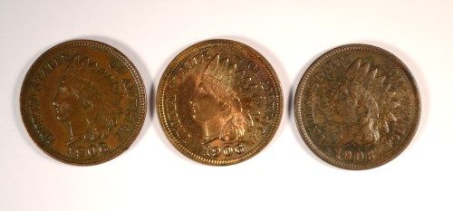 3-1906 INDIAN HEAD CENTS "GRADING SET" ( FINE, XF, AU)