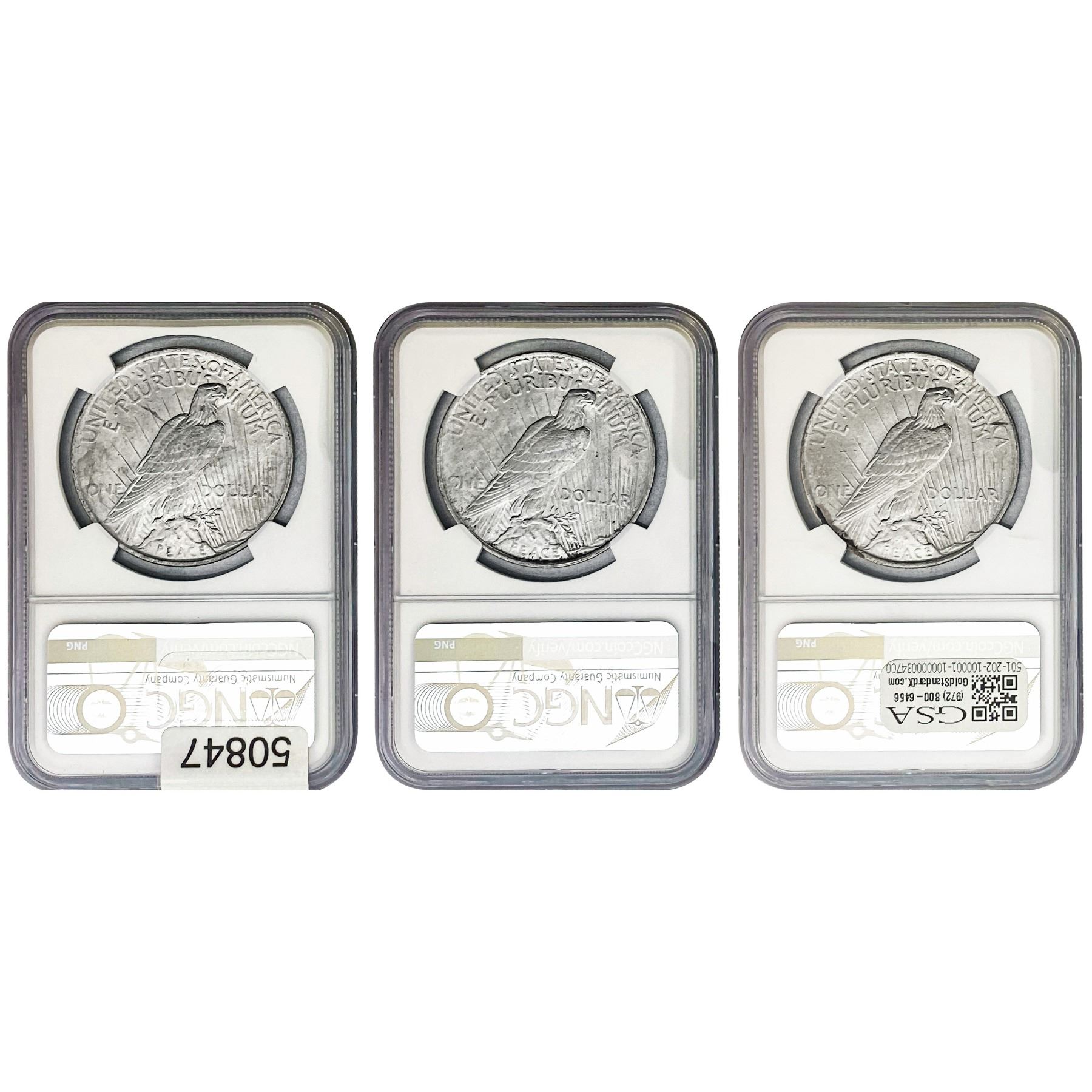 e. Coins sold referencing a third-party grading service are sold “AS IS” without any express or implied warranty, except for a guarantee by GSA that they are genuine. Removal or alteration of the holder, voids all of Bidder’s claims concerning that Product. Certain warranties may be available from the grading services and Bidders are referred to them for further details: Numismatic Guaranty Corporation (NGC), PO Box 4776, Sarasota, FL 34230, www.ngccoin.com/services/writtenguarantee.asp; Professional Coin Grading Services (PCGS), PO Box 9458, Newport Beach, CA 92658, www.pcgs.com/guarantee.html; ANACS, 6555 S. Kenton St., Ste. 303, Englewood, CO 80111; and Independent Coin Grading Co. (ICG), 7901 East Bellview, Ave., Suite 50, Englewood, CO 80111.