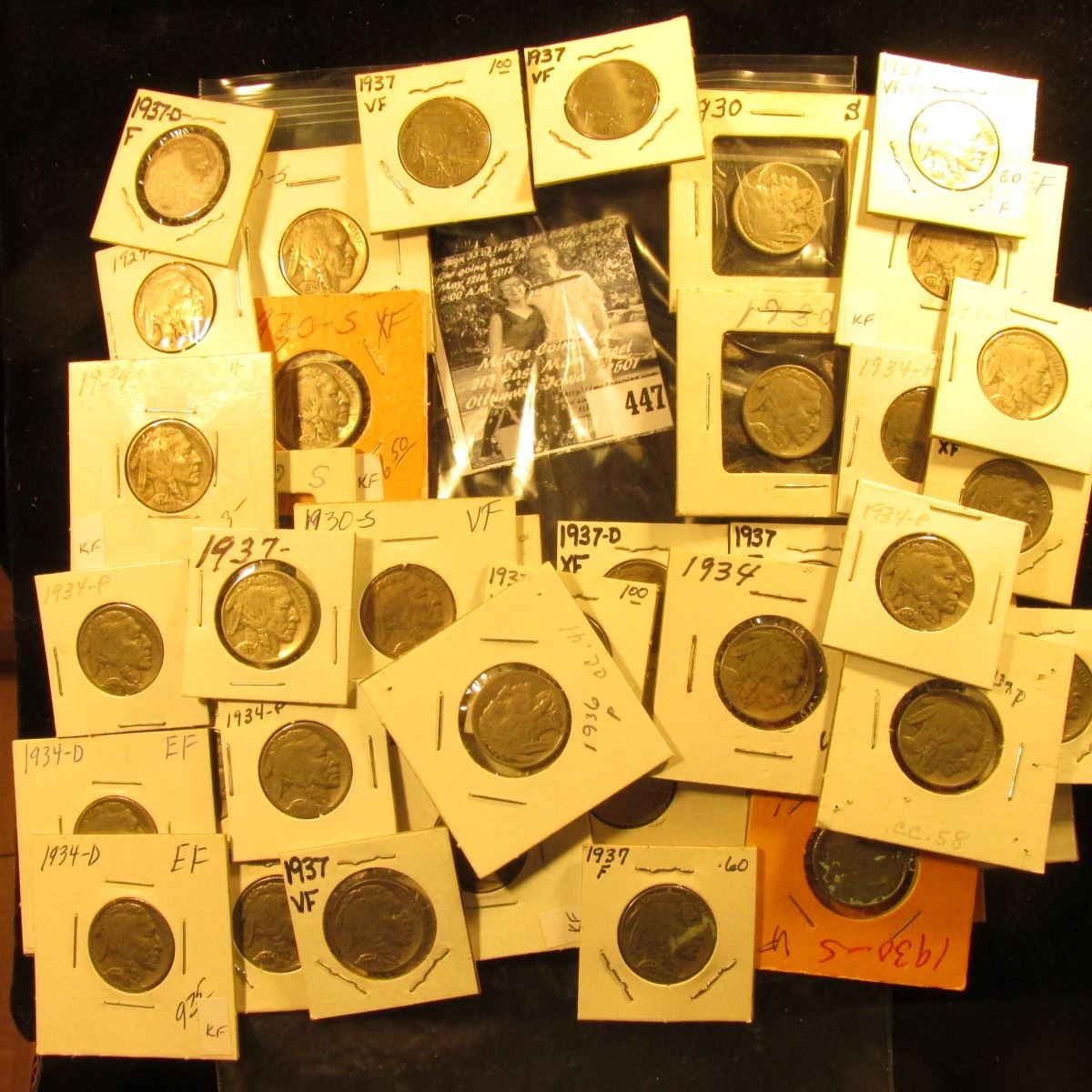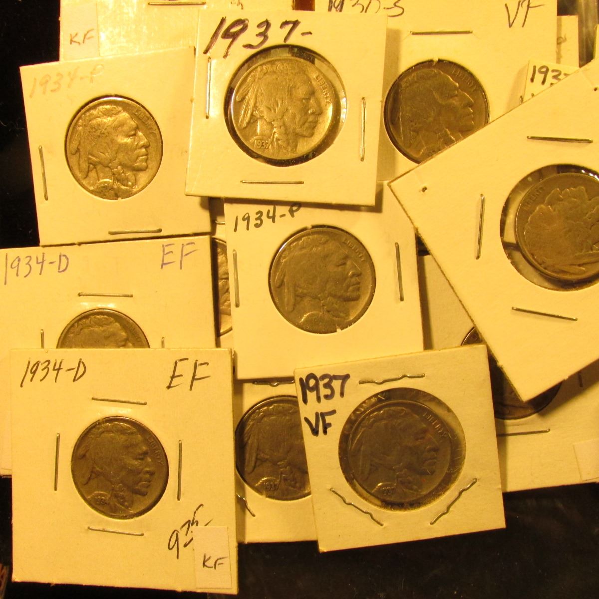 (3) 1929S, (10) 30S, (6) 34P, (7) D, (2) 36P, (13) 37P, & (2) 37D Buffalo Nickels, all carded with grades up to VF-EF.