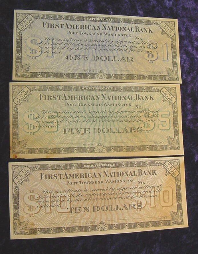 (3) 1933 Depression Scripts, Port Townsend Washington, $1., $5. & $10. Unissued, No Folds but yellowing of the paper.