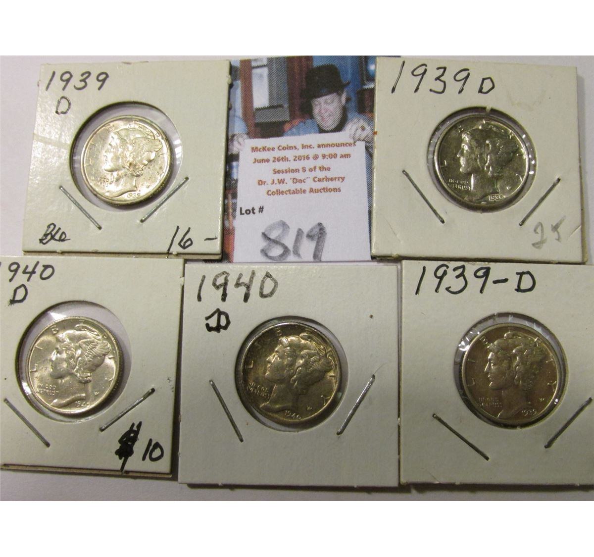 (3) 1939 D & (2) 40 D Mercury Dimes, AU to Uncirculated.