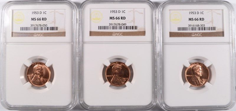 ( 3 ) 1953-D LINCOLN CENTS, NGC MS-66 RED GEMS!!