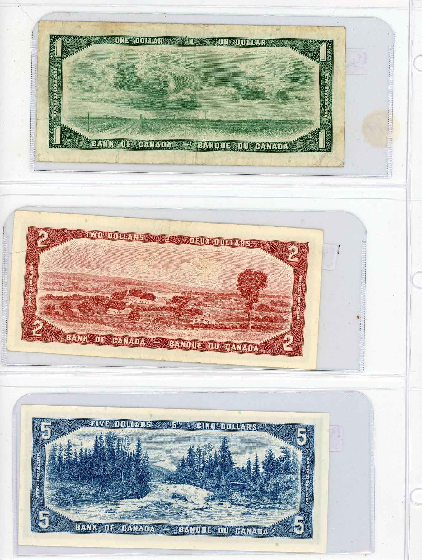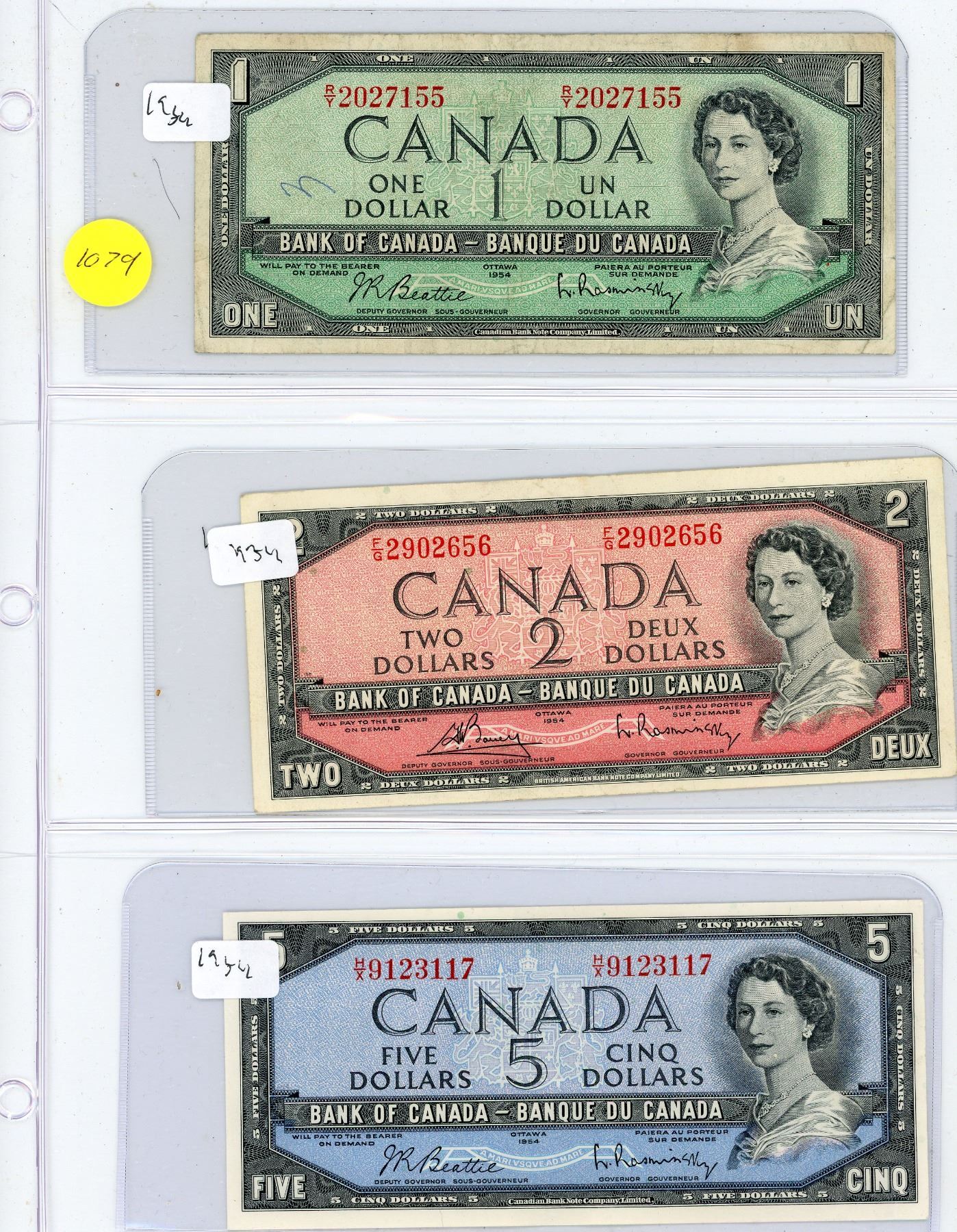 3 1954 Canadian Bank Notes, One, Two And Five Dollar