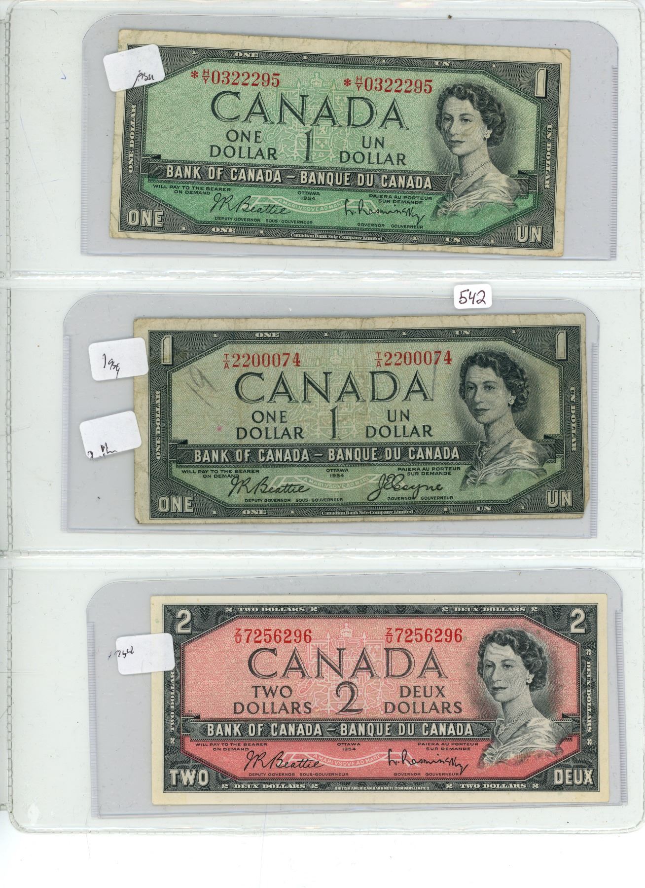 3 - 1954 Canadian bills - 1$ replacement, 1$ Devil's Face and 2$ bill