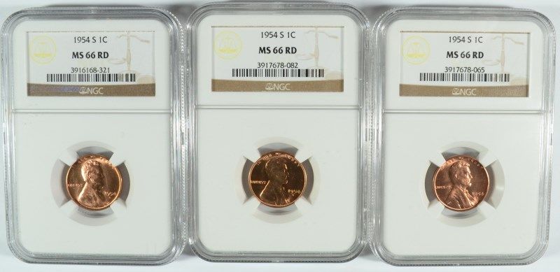 ( 3 ) 1954-S LINCOLN CENTS, NGC MS-66 RED GEMS!