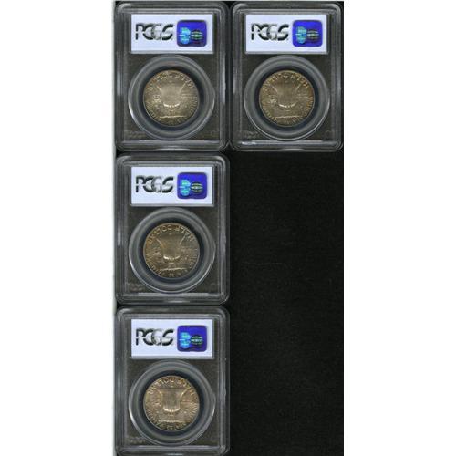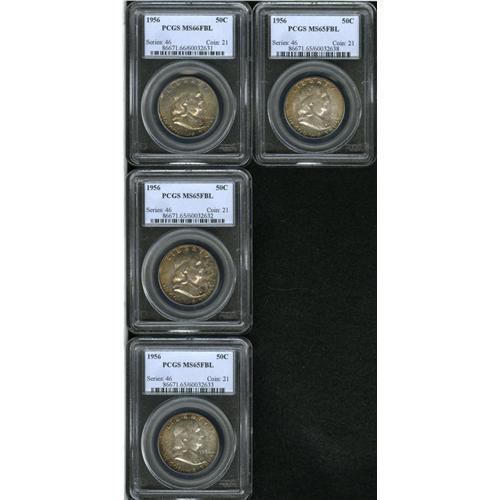 <B>(3) 1956 50C MS65 Full Bell Lines PCGS;</B></I> and <B>(1) 1956 MS66 Full Bell Lines PCGS.</B></I> Four well-matched Gems are offered in this lot. All are well struck and highly lustrous, with minimal surface blemishes and a deep layer of speckled, multicolored patina across both sides.<BR><I>From The Southern Collection.</B></I><BR><BR><b>Shipping:</b> Coins & Currency (<a target="_blank" href="http://www.heritageauctions.com/common/shipping.php">view shipping information</a>)