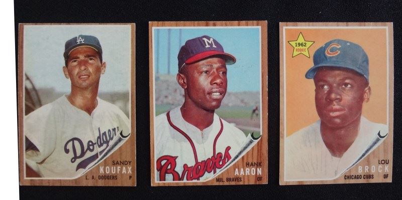 3 - 1962 TOPPS #5 KOUFAX, #320 AARON & #387 BROCK, ALL NICE EX - EX+