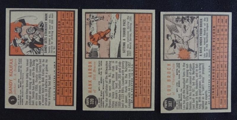 3 - 1962 TOPPS #5 KOUFAX, #320 AARON & #387 BROCK, ALL NICE EX - EX+