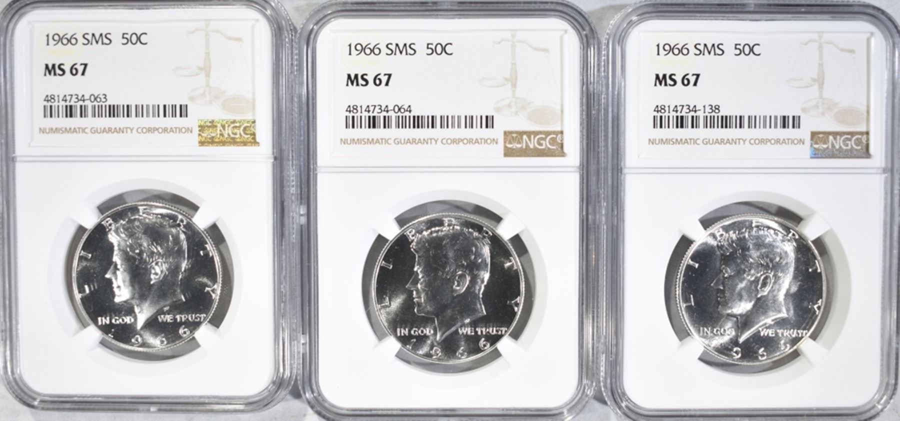 3-1966 SMS KENNEDY HALF DOLLARS, NGC MS-67