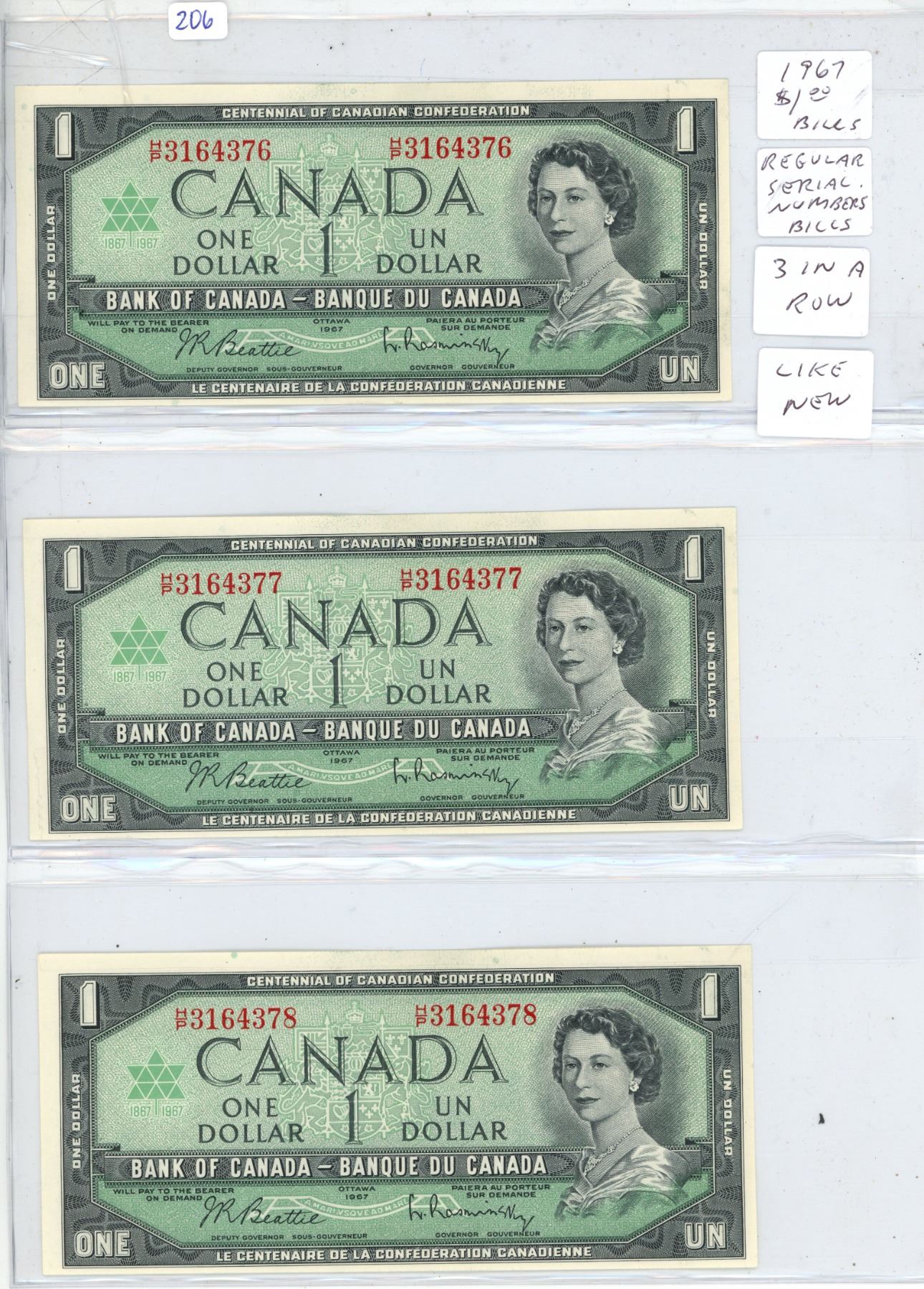 3- 1967 1 Dollar Bills(Regular Serial Bills, 3 Serial Bills in A Row) like new