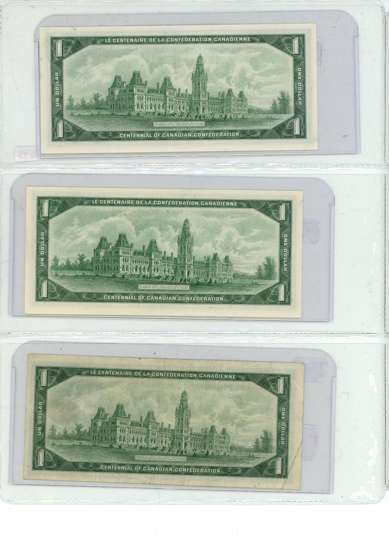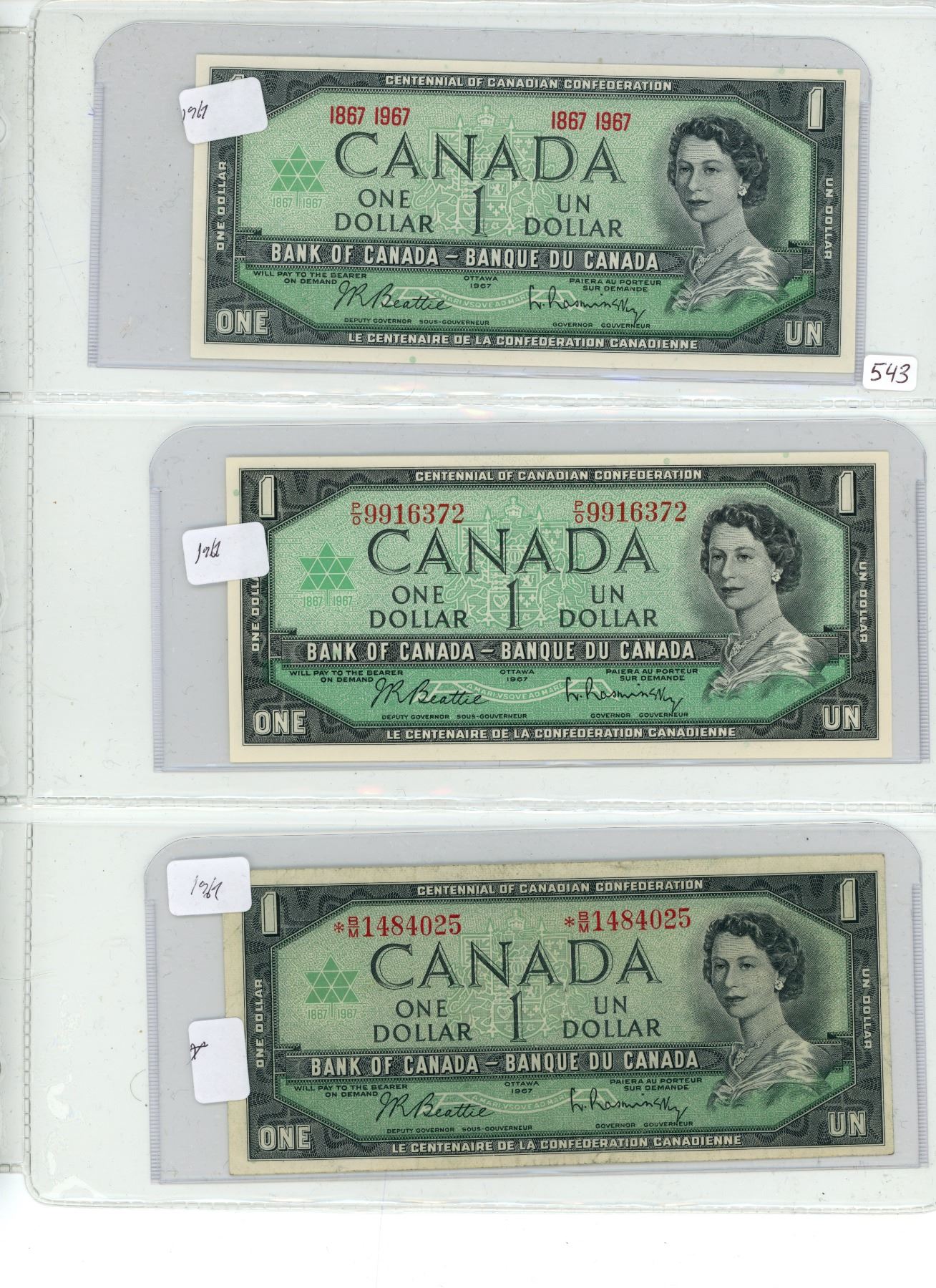 3 - 1967 Canadian centennial bills - 1 replacement, 1 without serial #'s
