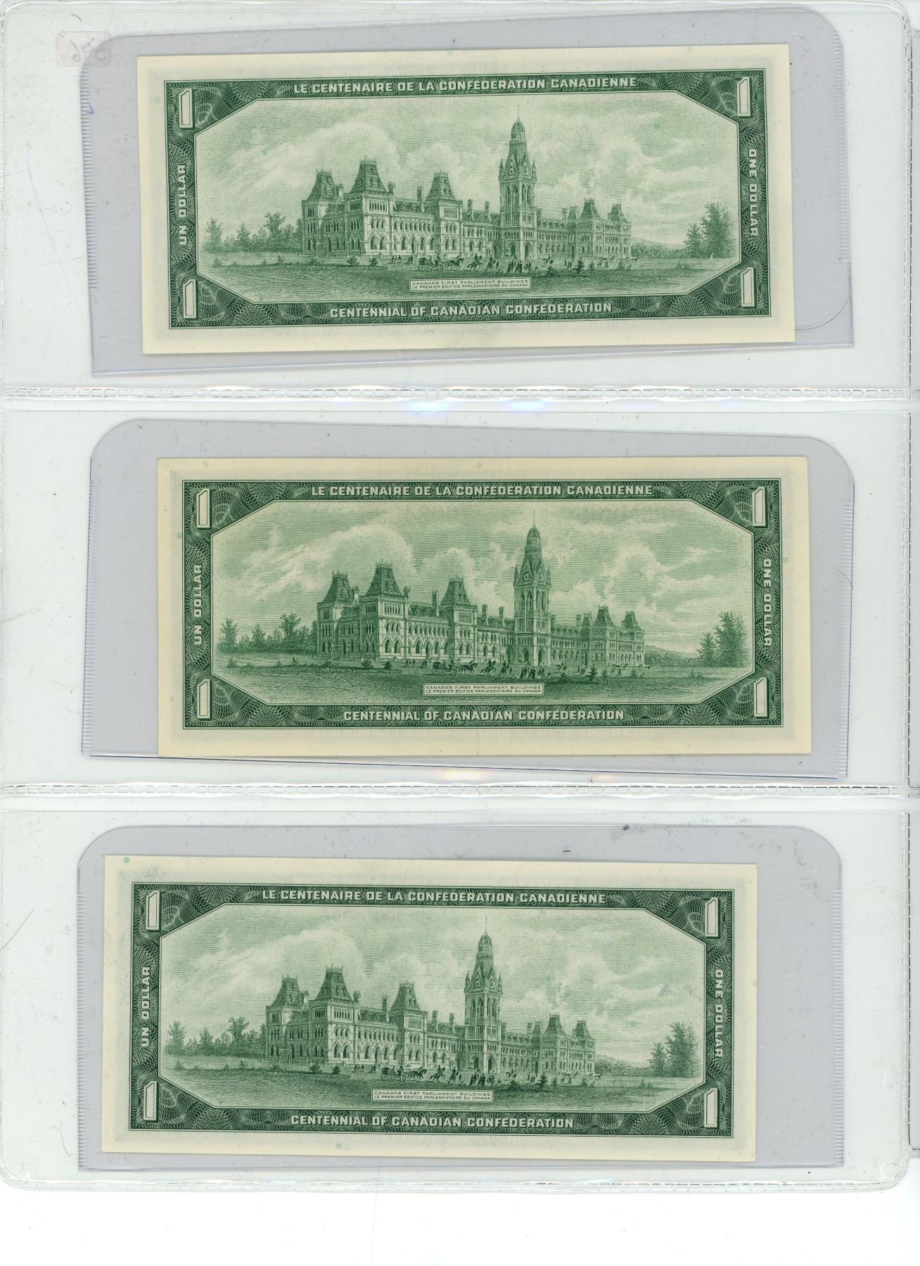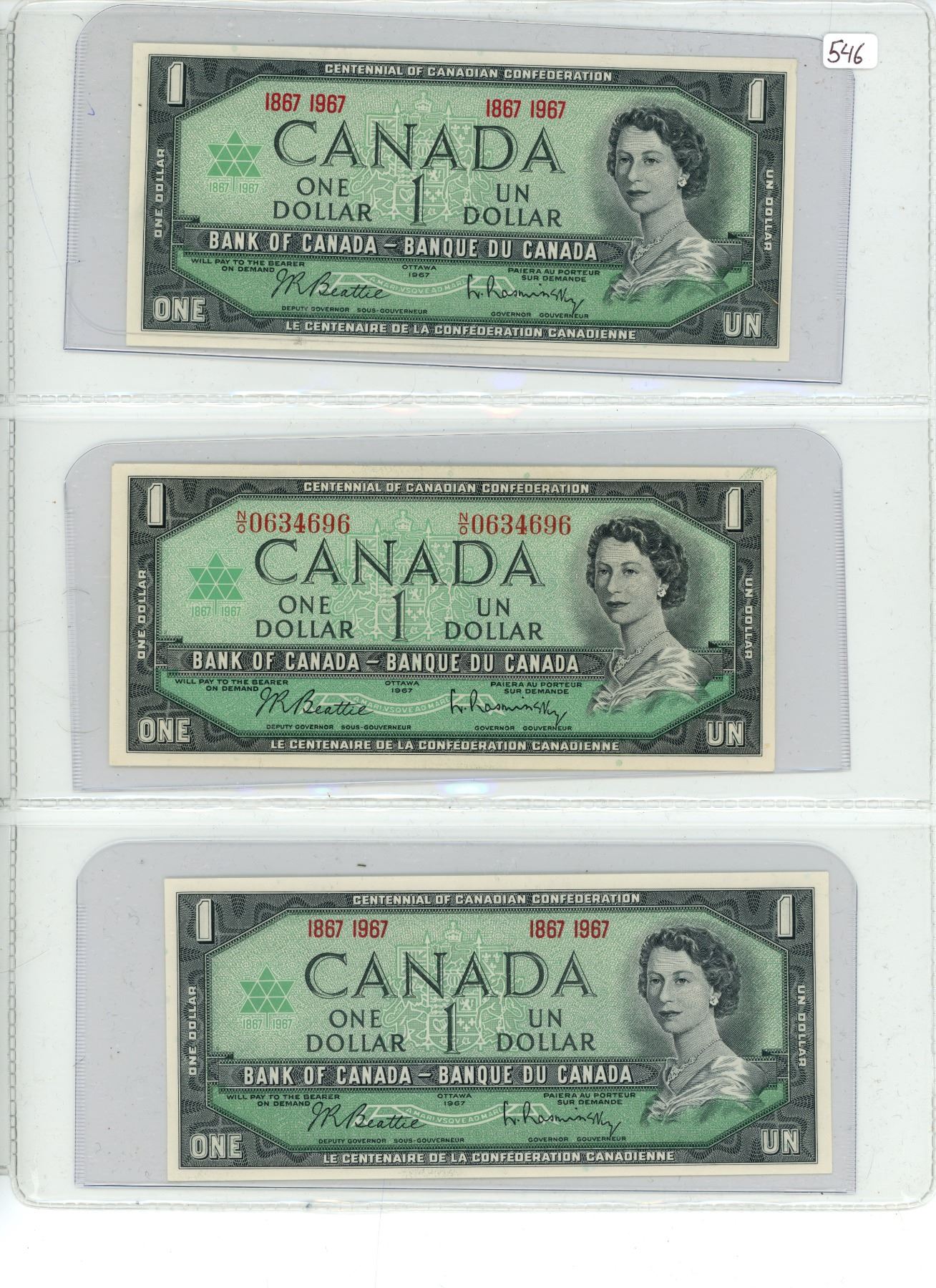3 - 1967 Canadian centennial bills - 2 no serial #'s