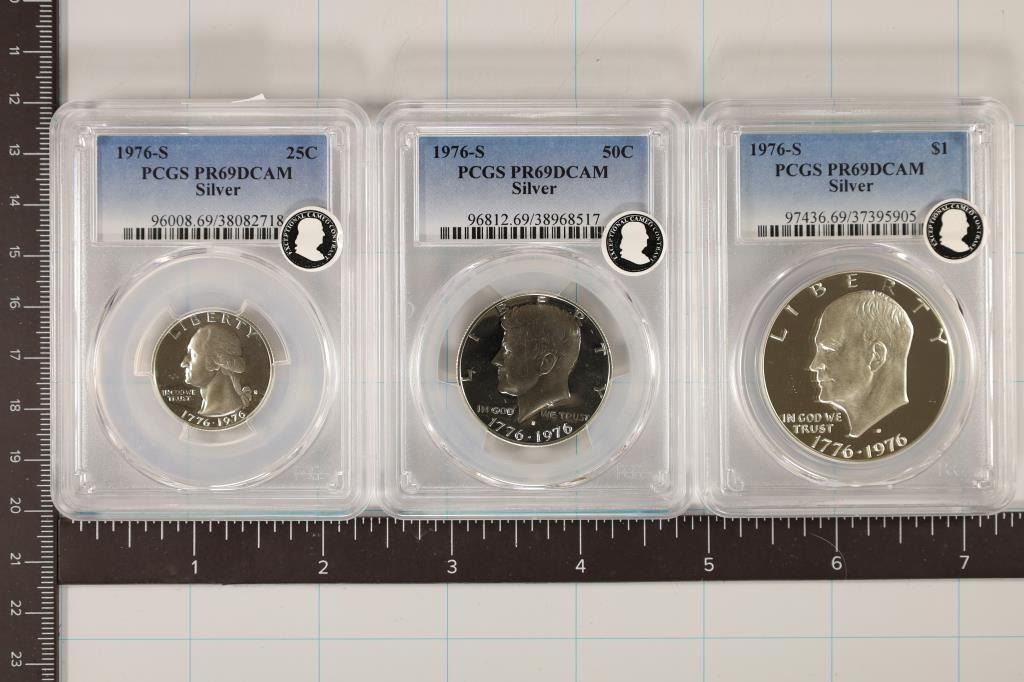 1976-S IKE SILVER DOLLAR, 1976-S SILVER KENNEDY HALF DOLLAR AND 1976-S WASHINGTON SILVER QUARTER. ALL WITH EXCEPTIONAL CAMEO CONTRAST STICKERS
