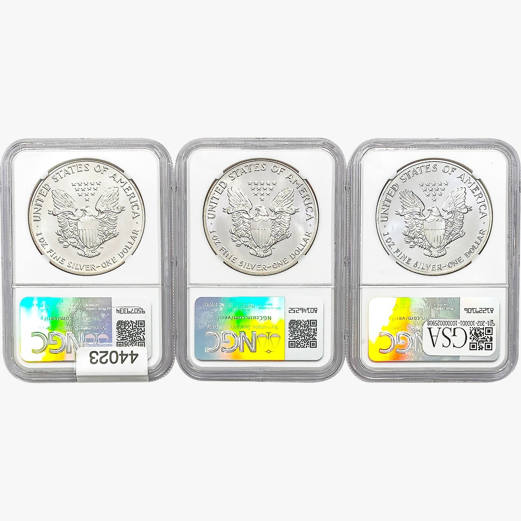 e. Coins sold referencing a third-party grading service are sold “AS IS” without any express or implied warranty, except for a guarantee by GSA that they are genuine. Removal or alteration of the holder, voids all of Bidder’s claims concerning that Product. Certain warranties may be available from the grading services and Bidders are referred to them for further details: Numismatic Guaranty Corporation (NGC), PO Box 4776, Sarasota, FL 34230, www.ngccoin.com/services/writtenguarantee.asp; Professional Coin Grading Services (PCGS), PO Box 9458, Newport Beach, CA 92658, www.pcgs.com/guarantee.html; ANACS, 6555 S. Kenton St., Ste. 303, Englewood, CO 80111; and Independent Coin Grading Co. (ICG), 7901 East Bellview, Ave., Suite 50, Englewood, CO 80111.