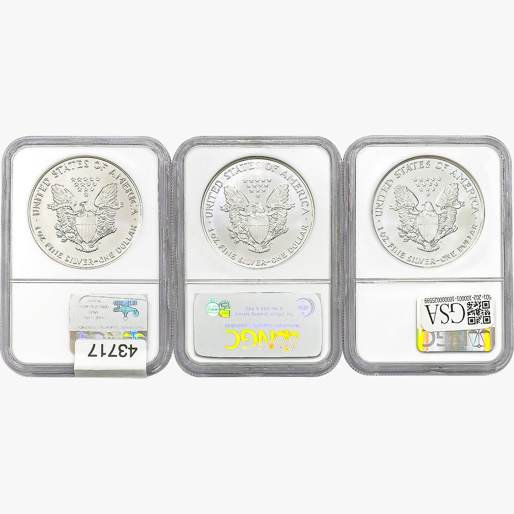 e. Coins sold referencing a third-party grading service are sold “AS IS” without any express or implied warranty, except for a guarantee by GSA that they are genuine. Removal or alteration of the holder, voids all of Bidder’s claims concerning that Product. Certain warranties may be available from the grading services and Bidders are referred to them for further details: Numismatic Guaranty Corporation (NGC), PO Box 4776, Sarasota, FL 34230, www.ngccoin.com/services/writtenguarantee.asp; Professional Coin Grading Services (PCGS), PO Box 9458, Newport Beach, CA 92658, www.pcgs.com/guarantee.html; ANACS, 6555 S. Kenton St., Ste. 303, Englewood, CO 80111; and Independent Coin Grading Co. (ICG), 7901 East Bellview, Ave., Suite 50, Englewood, CO 80111.