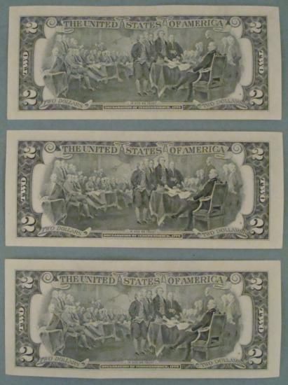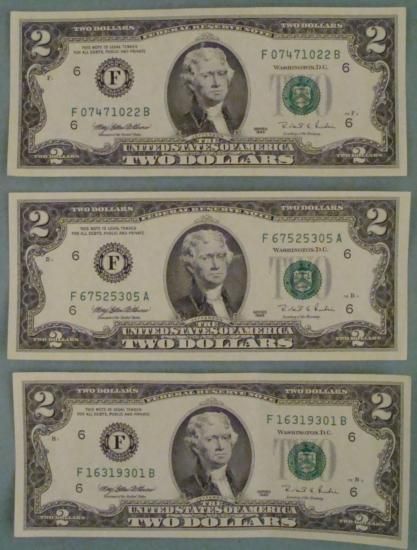 (3) 1995 $2 Bills Atlanta Notes * * Grade: Crisp Uncirculated * Mint mark: F (Atlanta) * Note: bills you receive will be different from those shown