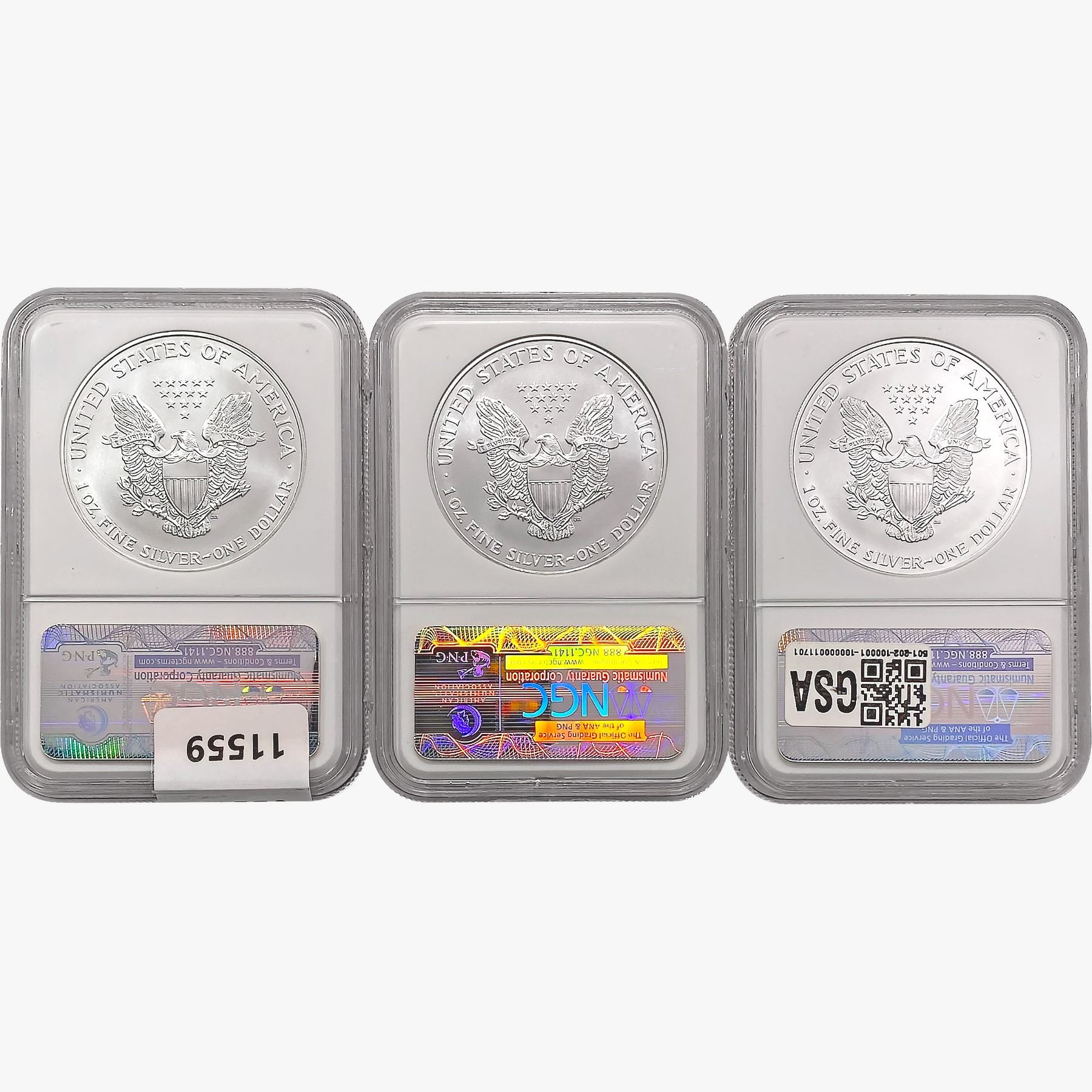 e. Coins sold referencing a third-party grading service are sold “AS IS” without any express or implied warranty, except for a guarantee by GSA that they are genuine. Removal or alteration of the holder, voids all of Bidder’s claims concerning that Product. Certain warranties may be available from the grading services and Bidders are referred to them for further details: Numismatic Guaranty Corporation (NGC), PO Box 4776, Sarasota, FL 34230, www.ngccoin.com/services/writtenguarantee.asp; Professional Coin Grading Services (PCGS), PO Box 9458, Newport Beach, CA 92658, www.pcgs.com/guarantee.html; ANACS, 6555 S. Kenton St., Ste. 303, Englewood, CO 80111; and Independent Coin Grading Co. (ICG), 7901 East Bellview, Ave., Suite 50, Englewood, CO 80111.