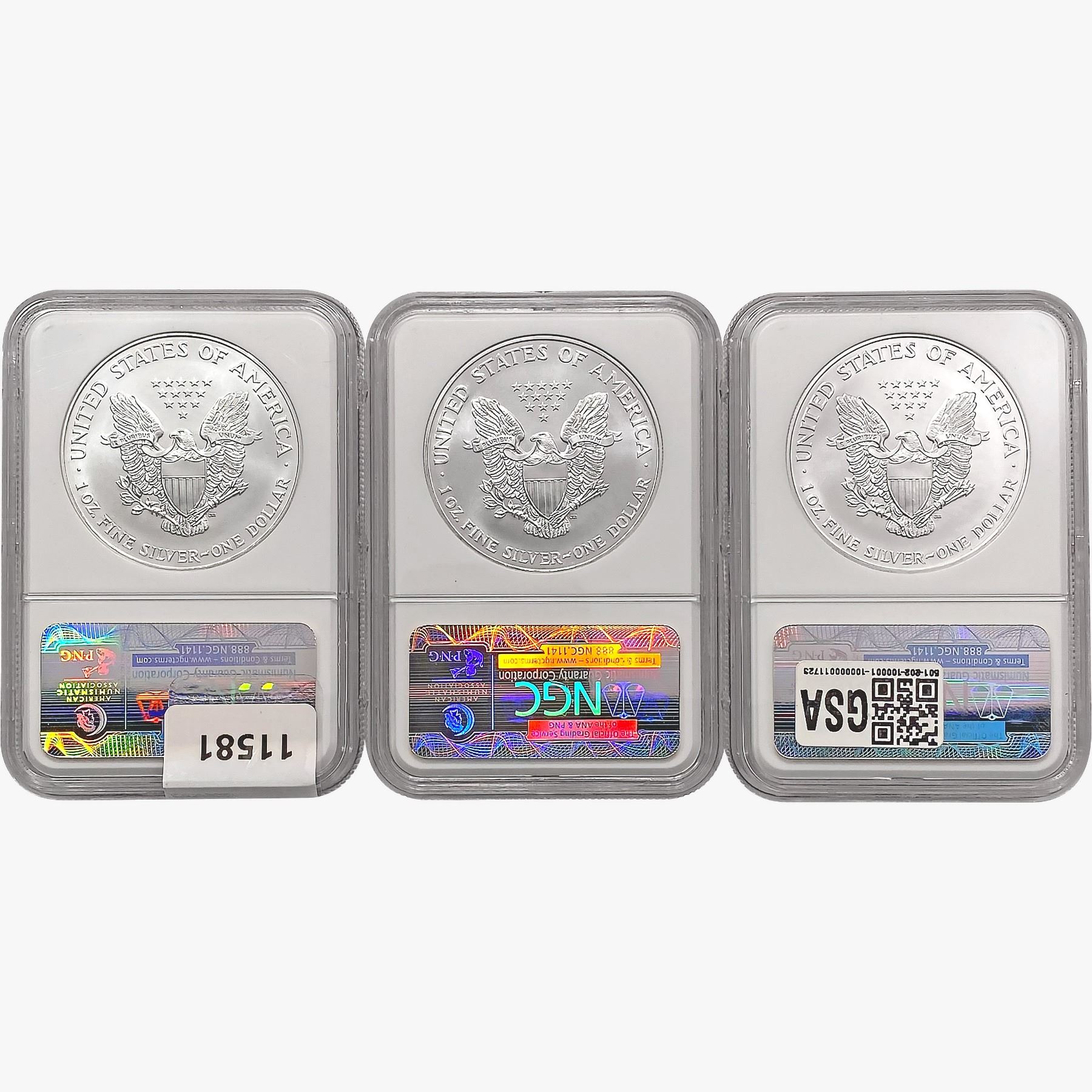 e. Coins sold referencing a third-party grading service are sold “AS IS” without any express or implied warranty, except for a guarantee by GSA that they are genuine. Removal or alteration of the holder, voids all of Bidder’s claims concerning that Product. Certain warranties may be available from the grading services and Bidders are referred to them for further details: Numismatic Guaranty Corporation (NGC), PO Box 4776, Sarasota, FL 34230, www.ngccoin.com/services/writtenguarantee.asp; Professional Coin Grading Services (PCGS), PO Box 9458, Newport Beach, CA 92658, www.pcgs.com/guarantee.html; ANACS, 6555 S. Kenton St., Ste. 303, Englewood, CO 80111; and Independent Coin Grading Co. (ICG), 7901 East Bellview, Ave., Suite 50, Englewood, CO 80111.
