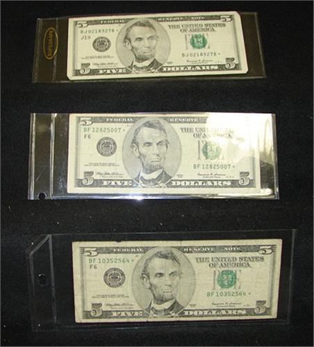 LOT OF 3 1999 $5 FEDERAL RESERVE NOTES. Green seal. Star notes.