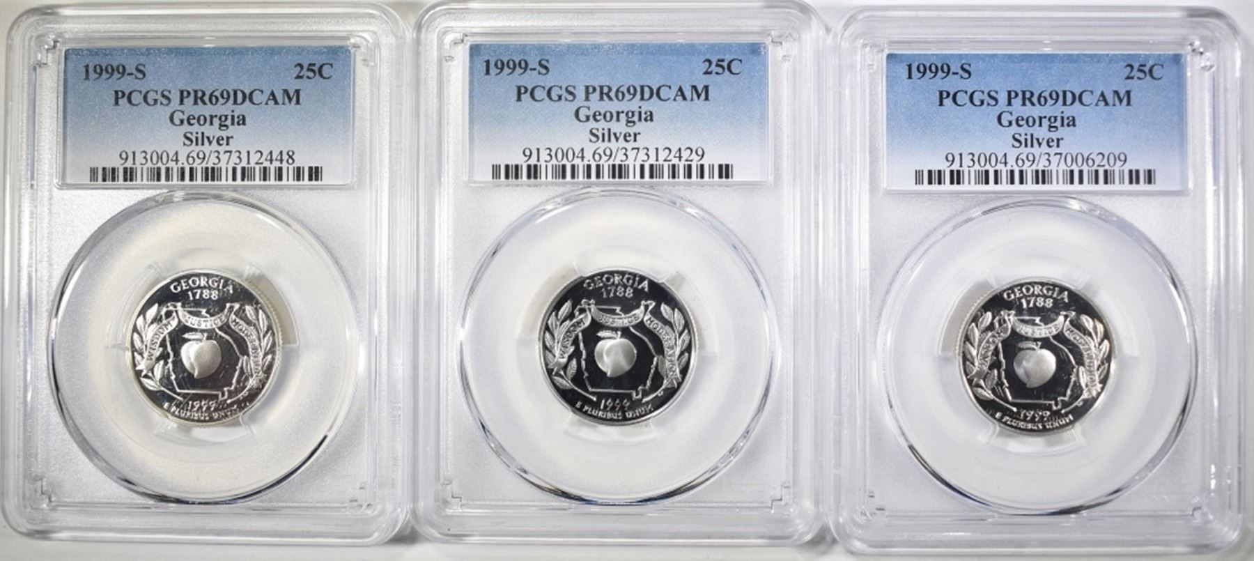 3- 1999-S SILVER GA STATE QTRS, PCGS PR-69 DCAM