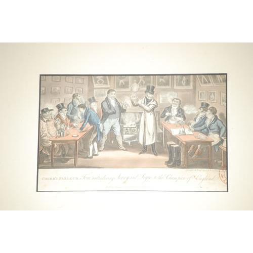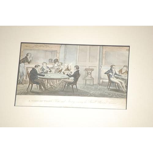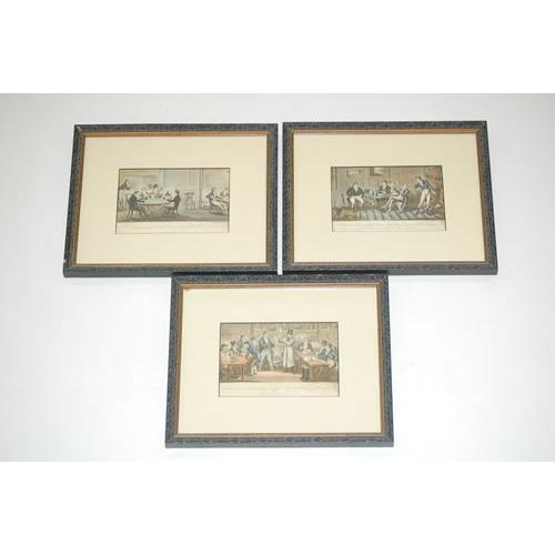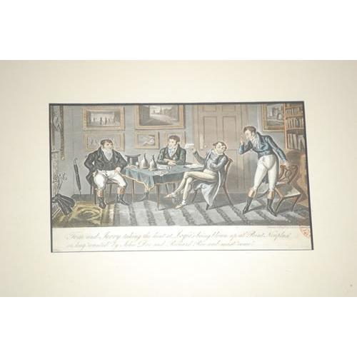 (3) 19TH CENT. CRUICKSHANK COLORED ENGRAVINGS-ENGLISH DRAWING ROOM ADVENTURES OF TOM, JERRY & LOGIC-BY I.R. & G. CRUICKSHANK & PUBL. BY SHERWOOD NEELY & JONES- JAN. 1 1821, MATTED IN MATCHING MOLDED FRAME (4.5" X 6.75") - WEAR, TONING, IMPERFECTIONS