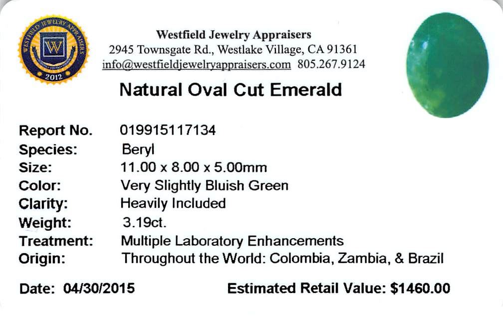 One oval mixed cut natural emerald approximate weight of 3.19ct., clarity is heavily included, type III, medium dark, very slightly grayish, very slightly bluish green color, (GIA vslbG 6/3), cut is good. Westfield Appraised at $1,460.00.