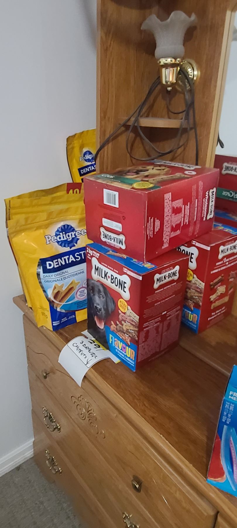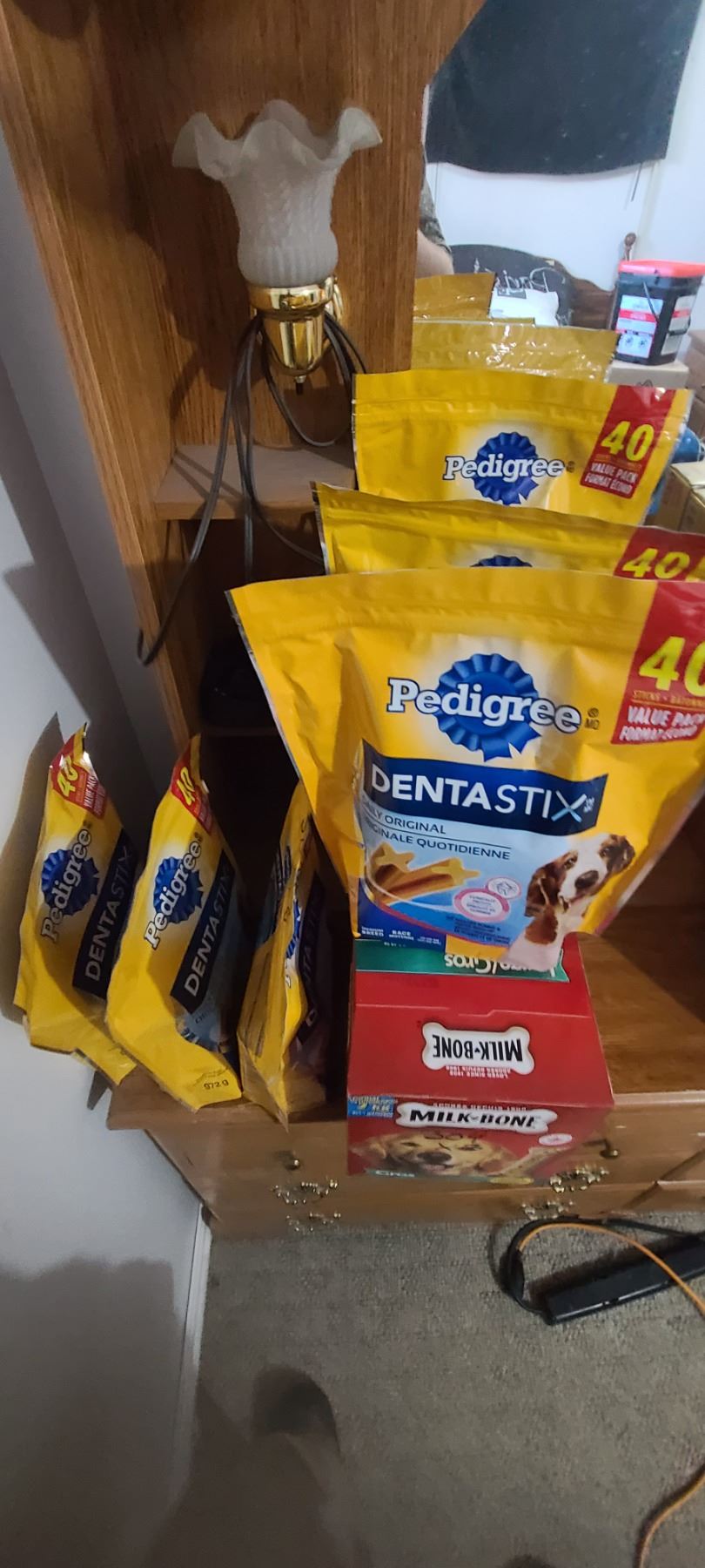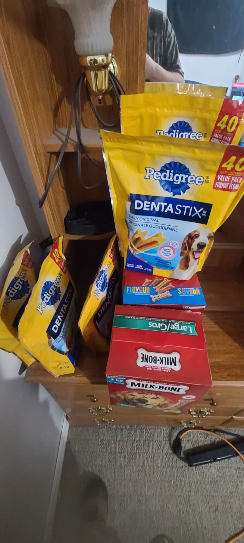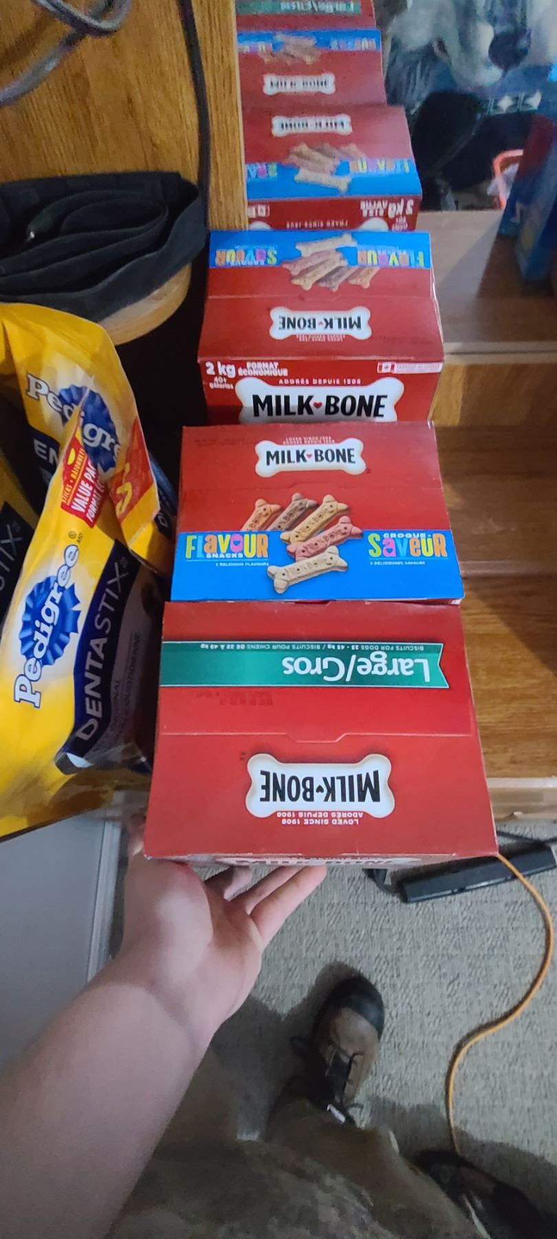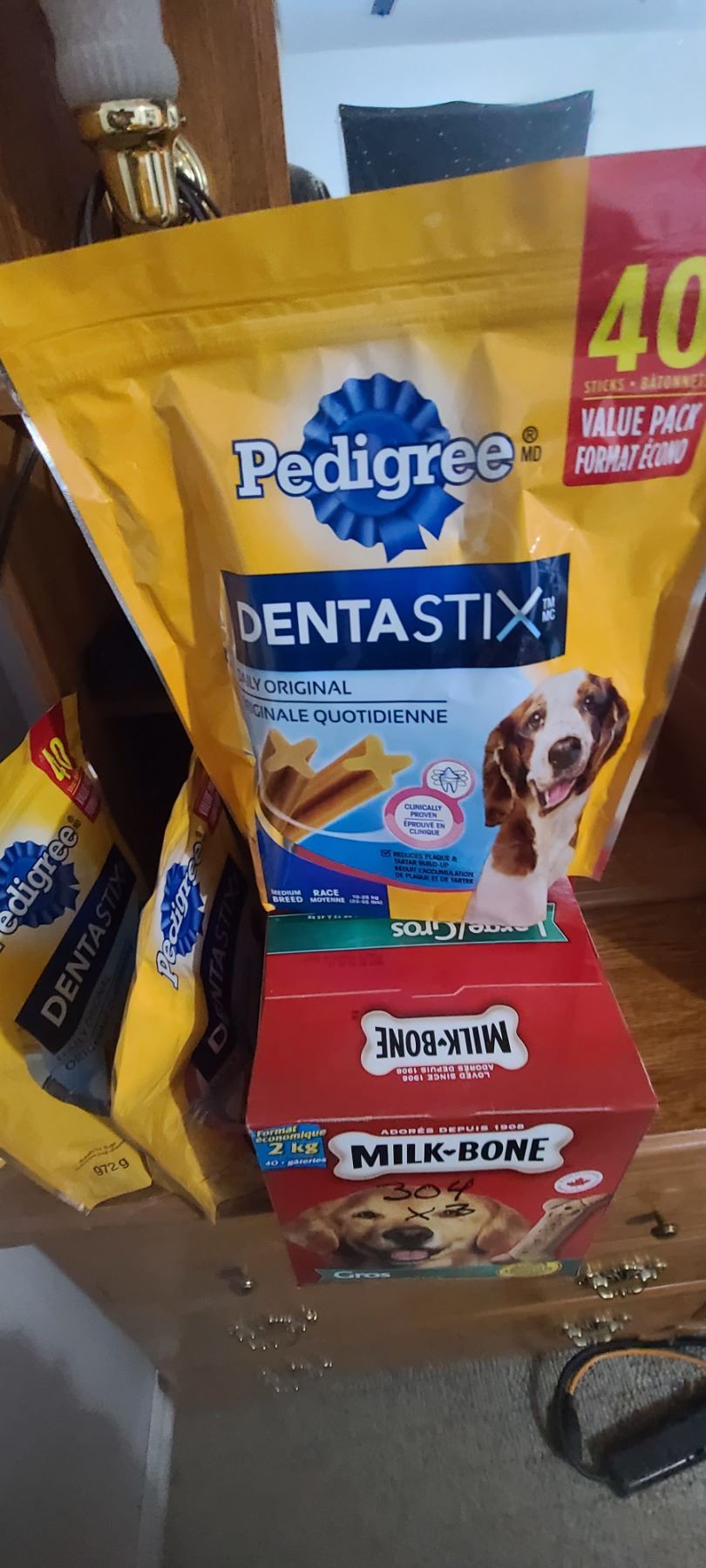 3- 2 KG BOXES OF MILK BONE MEDIUM DOG TREATS AND 6-40 PC BAGS OF DOG DENTA STIX