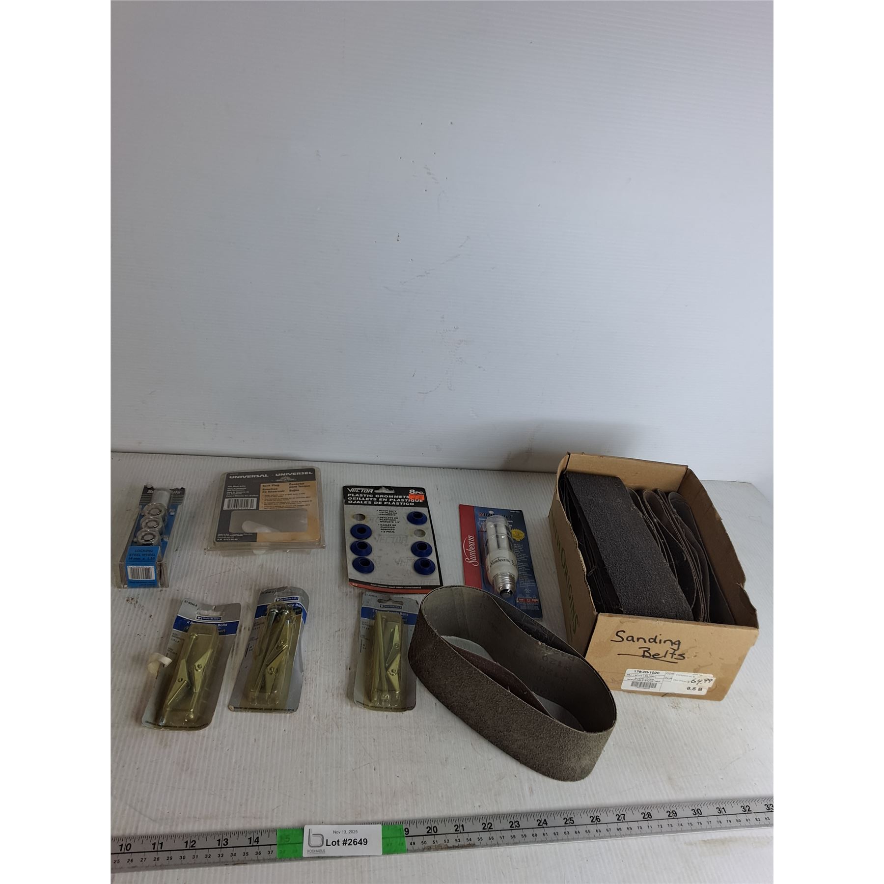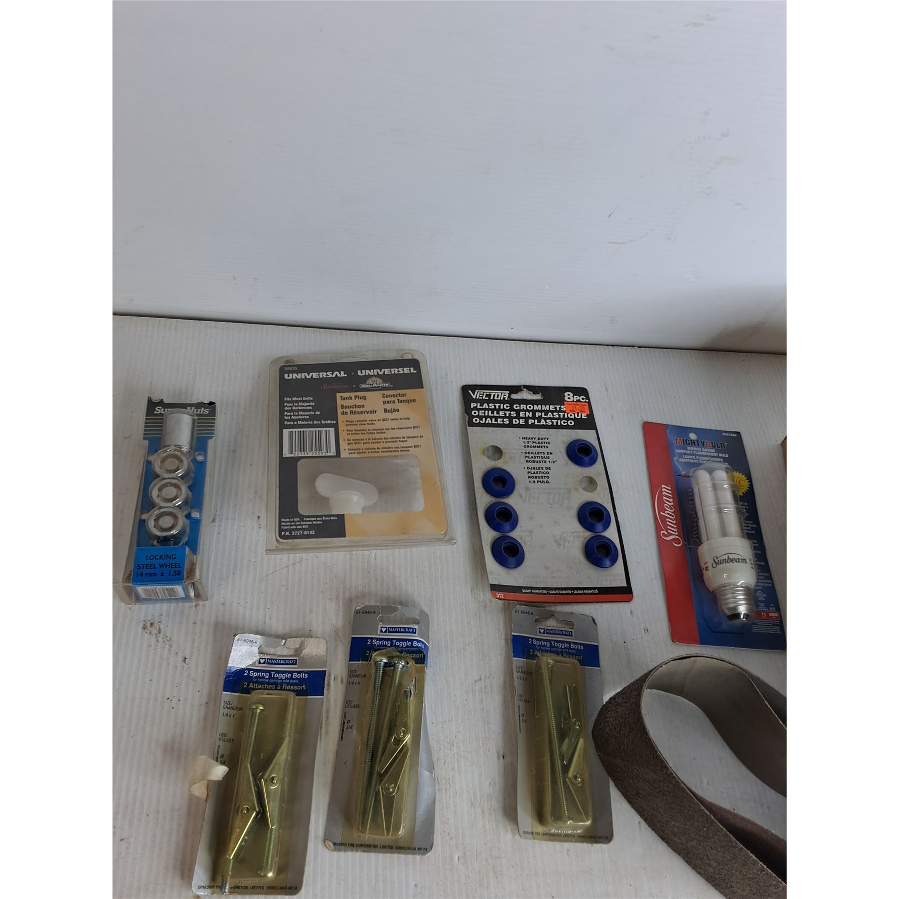 (3) 2 Spring Toggle Bolts, Locking Steel Wheel, Tank Plug Connector, Sanding Belts, Misc