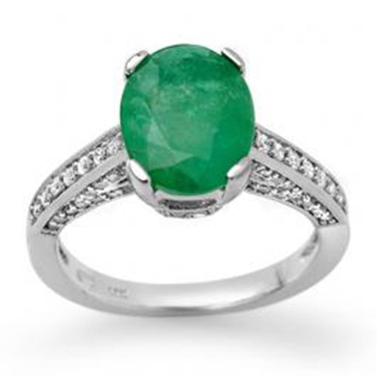 Diamond: 62 Round cut @ 0.50 ctw Clarity: SI-I Color: H-K Gemstone: Natural Emerald Gemstone color: GreenGemstone quality: Good-to-Very Good Gemstone Cut & Weight: 1 Oval cut @ 2.70 ctw Metal Purity & Color : 14K Gold-White Gold weight: 3.80 grams Ring size (US): 6.75Dimension: Approx. 5/16" x 3/4"