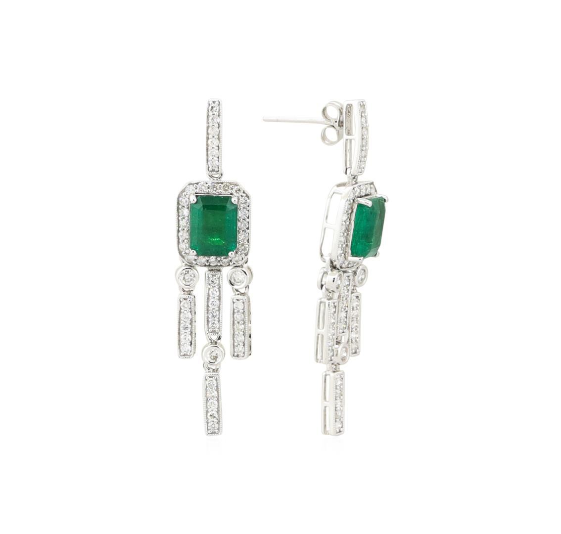 One pair electronically tested 18KT white gold ladies cast & assembled emerald & diamond dangle earrings. Each earring features a drop consisting of an emerald set within a stylized diamond bezel and diamond dangling fringe, supported by diamond set post and backings. Bright polish finish with milgrain detailing throughout. Trademark is Orianne. Identified with markings of "18K". Condition is new, very good workmanship. Containing: Two prong set emerald standard step cut natural emeralds, measuring 8.00 x 6.00 x 4.00mm, approximate total weight of 3.20ct., clarity is heavily included, type III, medium dark, very slightly grayish, very slightly bluish green color, (GIA vslbG 6/3), cut is good. Transmitting light with distortion, semi-transparent. Indications of oil residue. Naturally occurring internal & external characteristics are present. Measurements are an average for the pair. Graded in the setting. Ninety-Eight bead & bezel set round brilliant cut diamonds, measuring 2.00 - 1.40 x 1.02mm (depth est.) approximate total weight of 98 Stones = 1.14ct. Graded in the setting.Clarity I-1 to I-2 Color G - I Total Weight of Colored Stones 3.20 ct. Total Weight of Diamonds 1.14 ct. Total Weight of Dangle Earrings 7.86 gm Estimated Retail Value $ 11,400.00 US