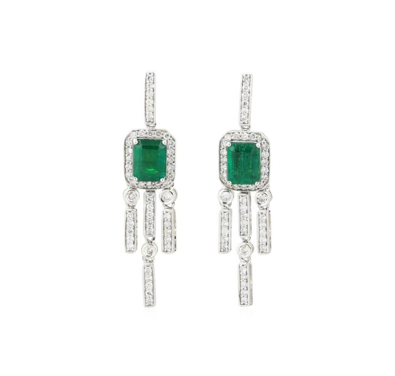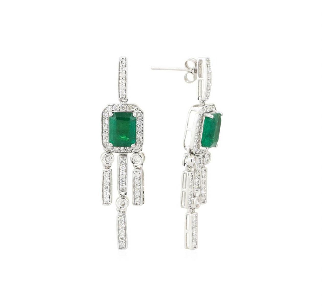 One pair electronically tested 18KT white gold ladies cast & assembled emerald & diamond dangle earrings. Each earring features a drop consisting of an emerald set within a stylized diamond bezel and diamond dangling fringe, supported by diamond set post and backings. Bright polish finish with milgrain detailing throughout. Trademark is Orianne. Identified with markings of "18K". Condition is new, very good workmanship. Containing: Two prong set emerald standard step cut natural emeralds, measuring 8.00 x 6.00 x 4.00mm, approximate total weight of 3.20 ct., clarity is heavily included, type III, medium dark, very slightly grayish, very slightly bluish green color, (GIA vslbG 6/3), cut is good. Transmitting light with distortion, semi-transparent. Indications of oil residue. Naturally occurring internal & external characteristics are present. Measurements are an average for the pair. Graded in the setting. Ninety-Eight bead & bezel set round brilliant cut diamonds, measuring 2.00 - 1.40 x 1.02mm (depth est.) approximate total weight of 98 Stones = 1.14ct. Graded in the setting.Clarity I-1 to I-2 Color G - I Total Weight of Colored Stones 3.20 ct. Total Weight of Diamonds 1.14 ct. Total Weight of Dangle Earrings 7.86 gm Estimated Retail Value $ 11,400.00 US