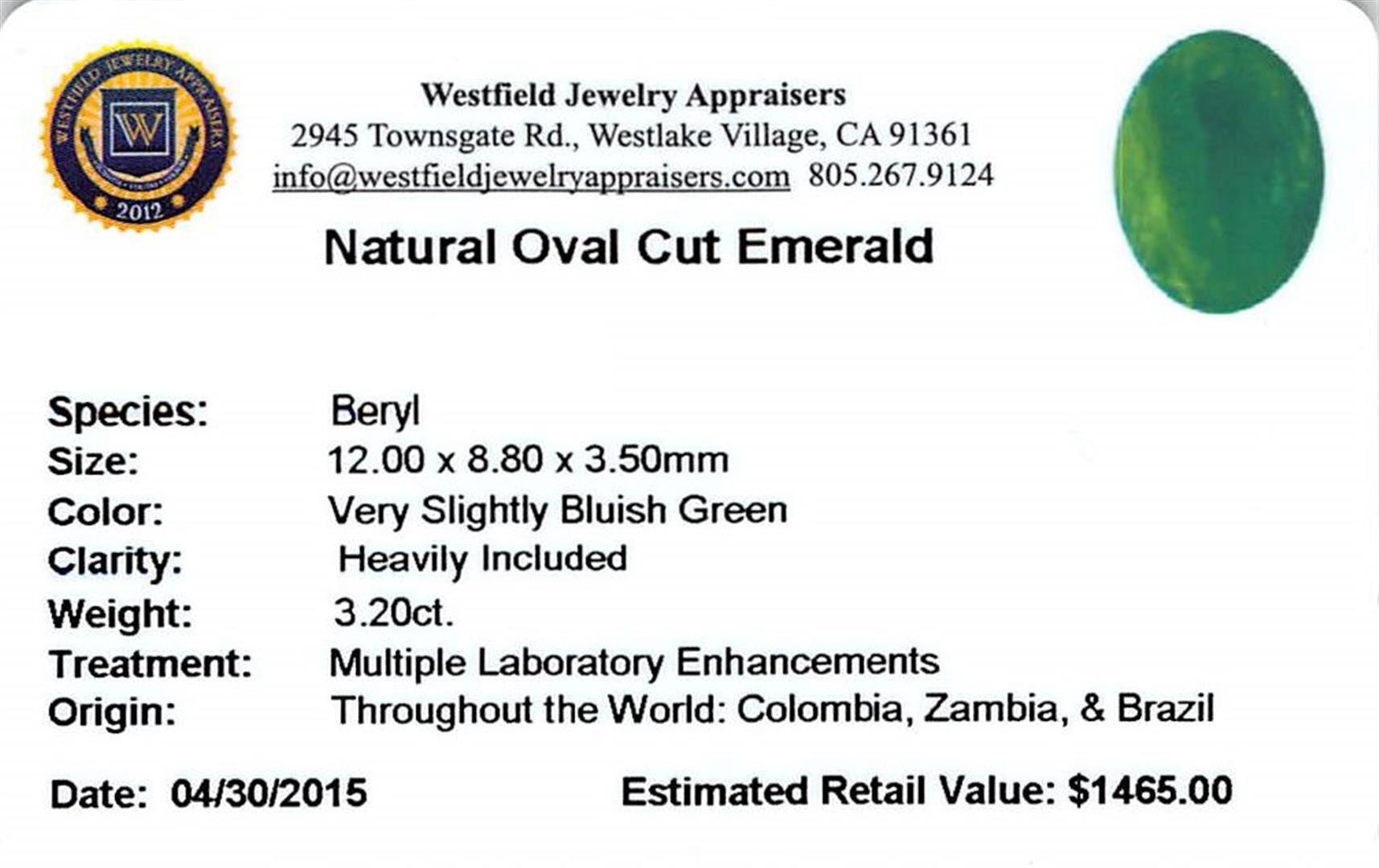 One oval cut natural emerald, measuring 12.00 x 8.80 x 3.50mm, exact weight 3.20ct., clarity is heavily included, type III, medium dark, very slightly grayish, very slightly bluish green color, (GIA vslbG 6/3) Westfield Appraised at $1,465.00.