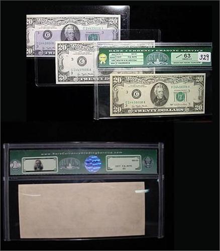 (3) $20.00 FRN Currency Error - Consecutive #'s, Center Note Graded CU 63 Blank Reverse