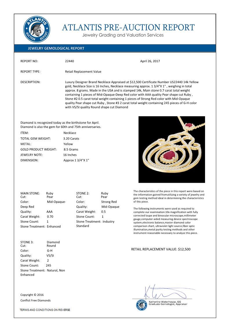 3.20 CTW Ruby And Micro Pave VS/SI Diamond Heart Necklace 14K Yellow Gold ---- Luxury Designer Brand Necklace Appraised Retail Price at $12,500  ---- SKU Number US22440 14k Yellow gold Necklace Size is 16 Inches, Necklace measuring approx. 1 3/4"X 1" , weighing in total approx. 8 grams. Made in the USA and is stamped 14k, Main stone 0.70 carat total weight containing 1 pieces of Mid-Opaque-Deep Red color with AAA quality Pear shape cut Ruby , Stone #2 0.5 carat total weight containing 1 pieces of Strong Red color with Mid-Opaque quality Pear shape cut