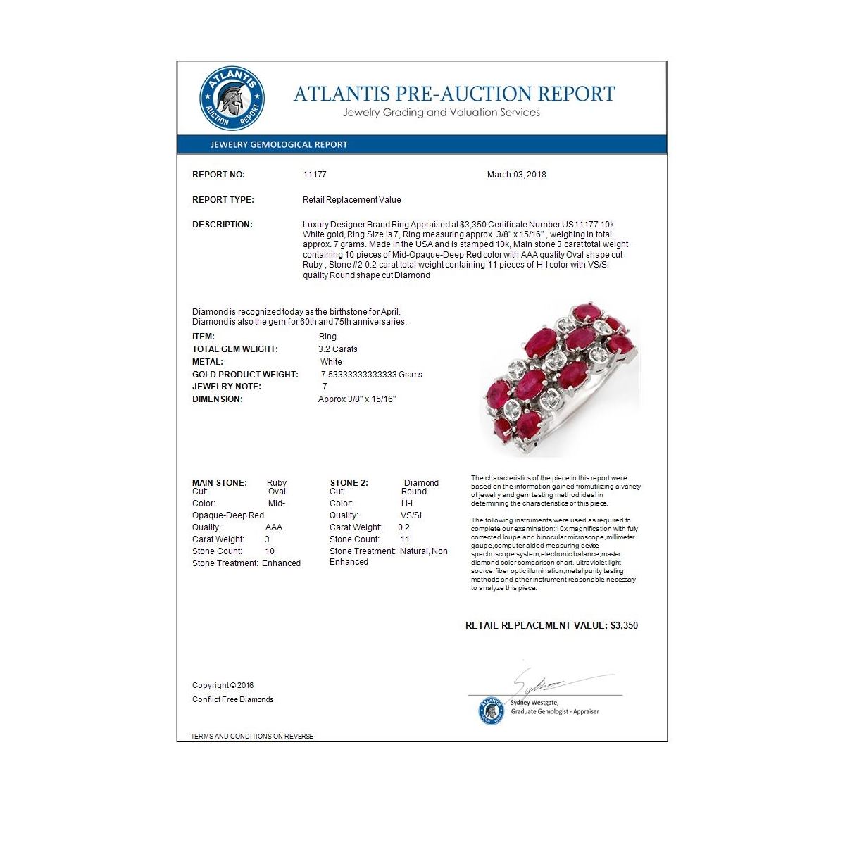 REF-46Y9K -11177 ---- 3.20 CTW Ruby & Diamond Ring 10K White Gold ---- Luxury Designer Brand Ring Appraised at $3,350 Certificate Number US11177 10k White gold, Ring Size is 7, Ring measuring approx. 3/8" x 15/16" , weighing in total approx. 7 grams. Made in the USA and is stamped 10k, Main stone 3 carat total weight containing 10 pieces of Mid-Opaque-Deep Red color with AAA quality Oval shape cut Ruby , Stone #2 0.2 carat total weight containing 11 pieces of H-I color with VS/SI quality Round shape cut Diamond