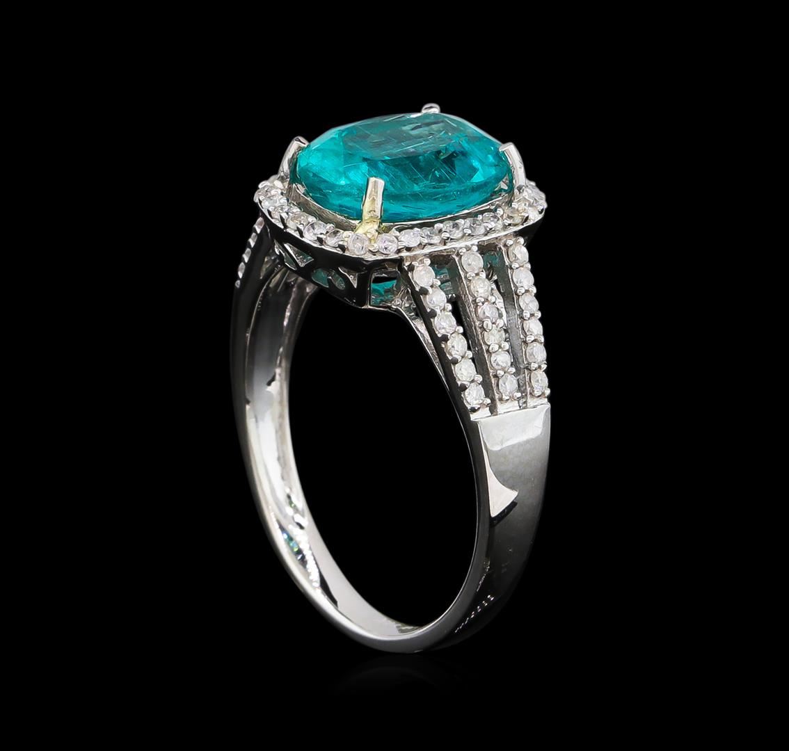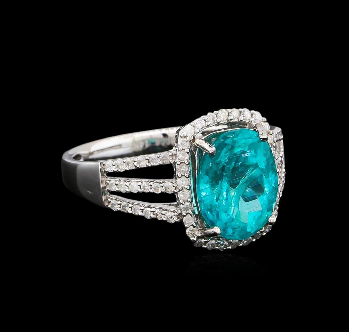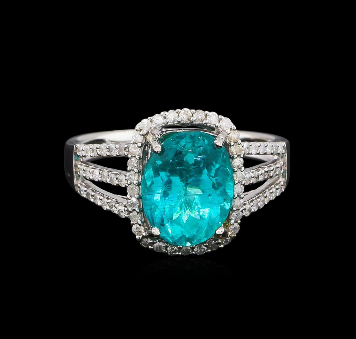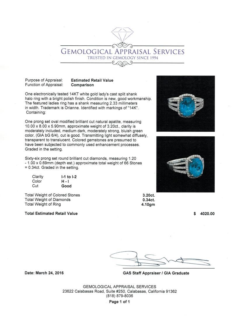 One electronically tested 14KT white gold lady's cast split shank halo ring with a bright polish finish. The featured ladies ring has a shank measuring 2.33 millimeters in width. Trademark is Orianne. Identified with markings of "14K". Condition is new, good workmanship. Containing: One prong set oval modified brilliant cut natural apatite, measuring 10.00 x 8.00 x 5.90mm, approximate weight of 3.20ct., clarity is moderately included, medium dark, moderately strong, bluish green color, (GIA bG 6/4), cut is good. Transmitting light somewhat diffusely, transparent to translucent. Colored gemstones are presumed to have been subjected to commonly used enhancement processes. Graded in the setting. Sixty-Six prong set round brilliant cut diamonds, measuring 1.20 - 1.00 x 0.69mm (depth est.) approximate total weight of 66 Stones = 0.34ct. Graded in the setting. Clarity: I-1 to I-2. Color: H - I. Cut Good. Total Weight of Colored Stones 3.20ct. Total Weight of Diamonds 0.34ct. Total Weight of Ring 4.10gm. GAS Appraised at $4,020.00.