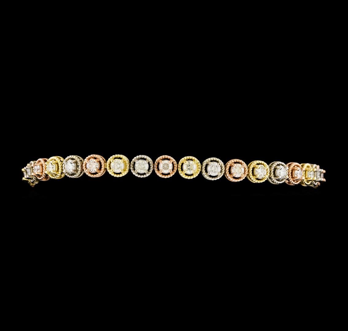 One electronically tested 14KT yellow, white, and rose gold lady's combination cast & assembled tennis bracelet with a tongue clasp with foldover safety with a bright polish with milgrain detailing finish. The featured lady's bracelet measures approximately 7.25 inches in length. Identified with markings of 'K14'. Condition is new, good workmanship. Containing: Thirty-Five prong set round brilliant cut diamonds, measuring 2.90 - 2.85 x 1.79mm (depth est.) approximate total weight of 35 Stones = 3.20ct. Graded in the setting. Clarity SI-1 to SI-2. Color: H - J Cut Good. Total Weight of Diamonds 3.20ct.. Total Weight of Bracelet 12.30gm. GAS Appraised at $8,460.00.