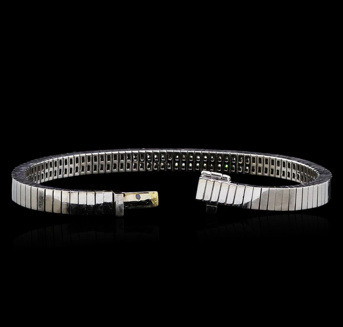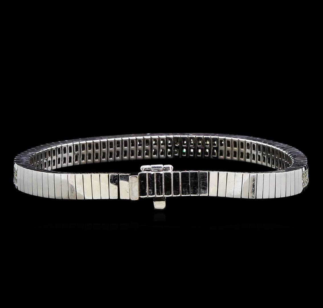 One electronically tested 18KT white gold ladies cast & assembled diamond bracelet. Six and one-half inch wearable length bracelet features a five millimeter wide diamond ribbon transitioning into white gold links, terminating in a concealed clasp with safety. Bright polish finish. Identified with markings of "18K". Condition is good. Containing: One Hundred Twenty channel set princess cut diamonds, measuring 1.70 x 1.60 x 1.20mm (depth est.) approximate total weight of 120 Stones = 3.20ct. Graded in the setting. Clarity: VS-2 to SI-2. Color: H - J. Total Weight of Diamonds 3.20ct. Total Weight of Bracelet 30.30gm. AIG Appraised at $13,900.00.